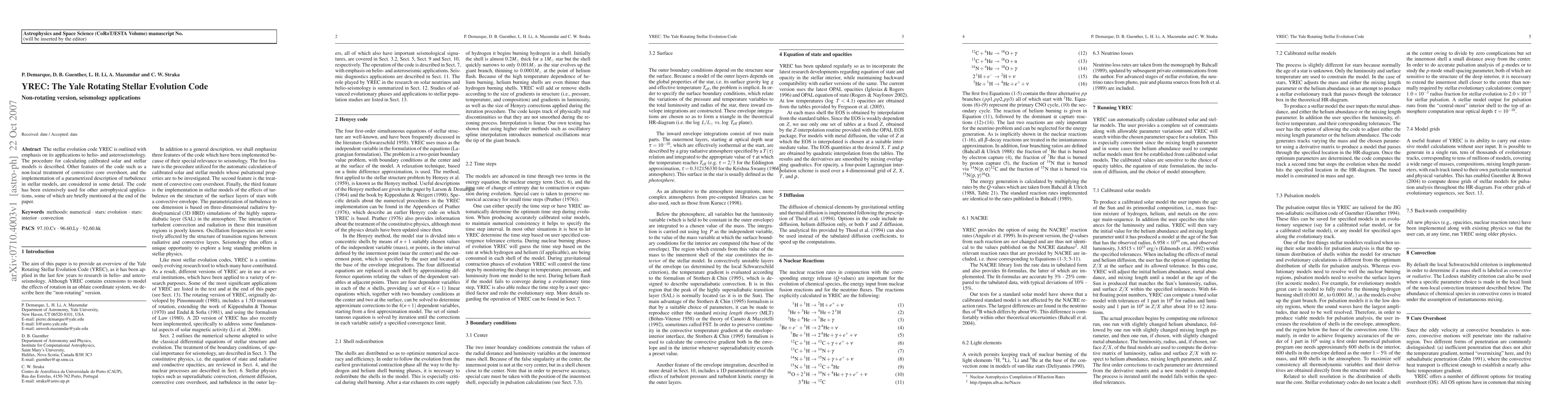 The Yale Rotating Stellar Evolution Code (YREC) is designed for helio- and asteroseismology, featuring calibrated solar and stellar models, non-local convective core overshoot, and a parametrized turbulence model. The code has also been applied in various astrophysical research areas.