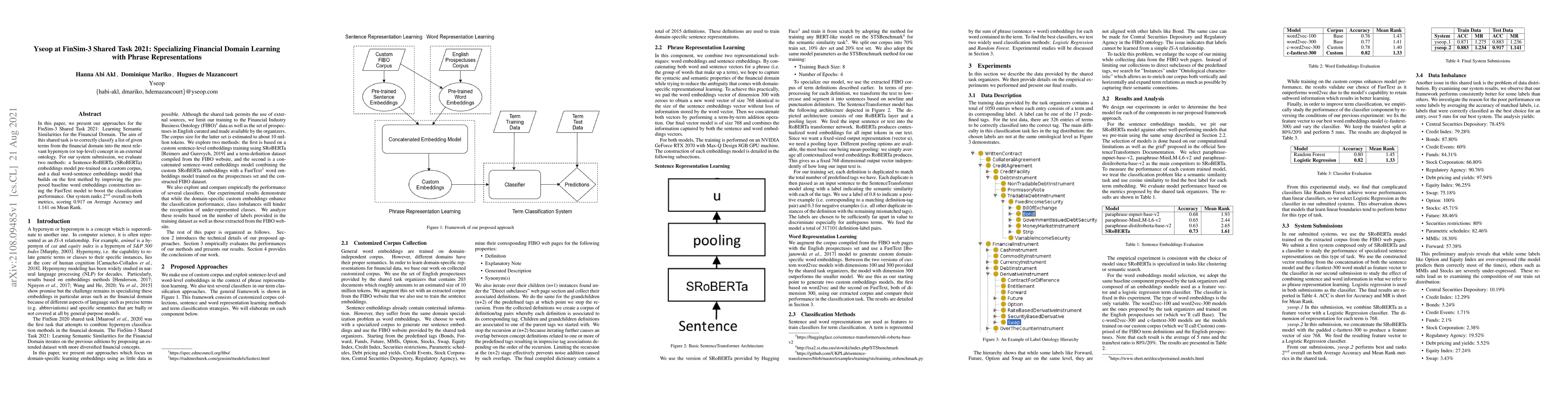 In this paper, we present our approaches for the FinSim-3 Shared Task 2021: Learning Semantic Similarities for the Financial Domain. The aim of this shared task is to correctly classify a list of given terms from the financial domain into the most relevant hypernym (or top-level) concept in an external ontology. For our system submission, we evaluate two methods: a Sentence-RoBERTa (SRoBERTa) embeddings model pre-trained on a custom corpus, and a dual word-sentence embeddings model that builds on the first method by improving the proposed baseline word embeddings construction using the FastText model to boost the classification performance. Our system ranks 2nd overall on both metrics, scoring 0.917 on Average Accuracy and 1.141 on Mean Rank.