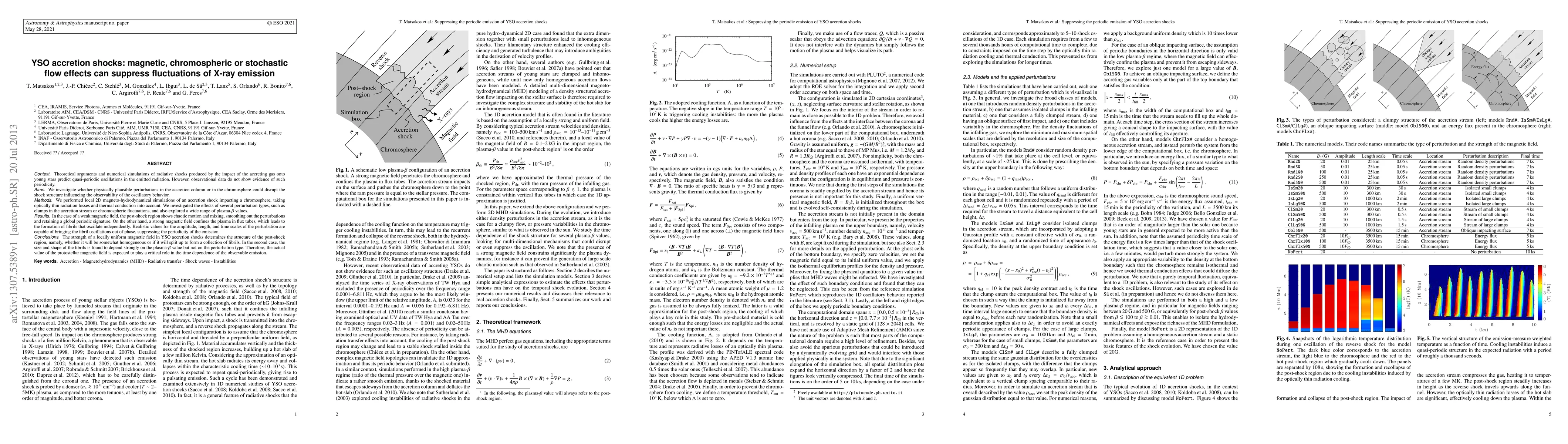 Context. Theoretical arguments and numerical simulations of radiative shocks produced by the impact of the accreting gas onto young stars predict quasi-periodic oscillations in the emitted radiation. However, observational data do not show evidence of such periodicity. Aims. We investigate whether physically plausible perturbations in the accretion column or in the chromosphere could disrupt the shock structure influencing the observability of the oscillatory behavior. Methods. We performed local 2D magneto-hydrodynamical simulations of an accretion shock impacting a chromosphere, taking optically thin radiation losses and thermal conduction into account. We investigated the effects of several perturbation types, such as clumps in the accretion stream or chromospheric fluctuations, and also explored a wide range of plasma-\beta values. Results. In the case of a weak magnetic field, the post-shock region shows chaotic motion and mixing, smoothing out the perturbations and retaining a global periodic signature. On the other hand, a strong magnetic field confines the plasma in flux tubes, which leads to the formation of fibrils that oscillate independently. Realistic values for the amplitude, length, and time scales of the perturbation are capable of bringing the fibril oscillations out of phase, suppressing the periodicity of the emission. Conclusions. The strength of a locally uniform magnetic field in YSO accretion shocks determines the structure of the post-shock region, namely, whether it will be somewhat homogeneous or if it will split up to form a collection of fibrils. In the second case, the size and shape of the fibrils is found to depend strongly on the plasma-\beta value but not on the perturbation type. Therefore, the actual value of the protostellar magnetic field is expected to play a critical role in the time dependence of the observable emission.