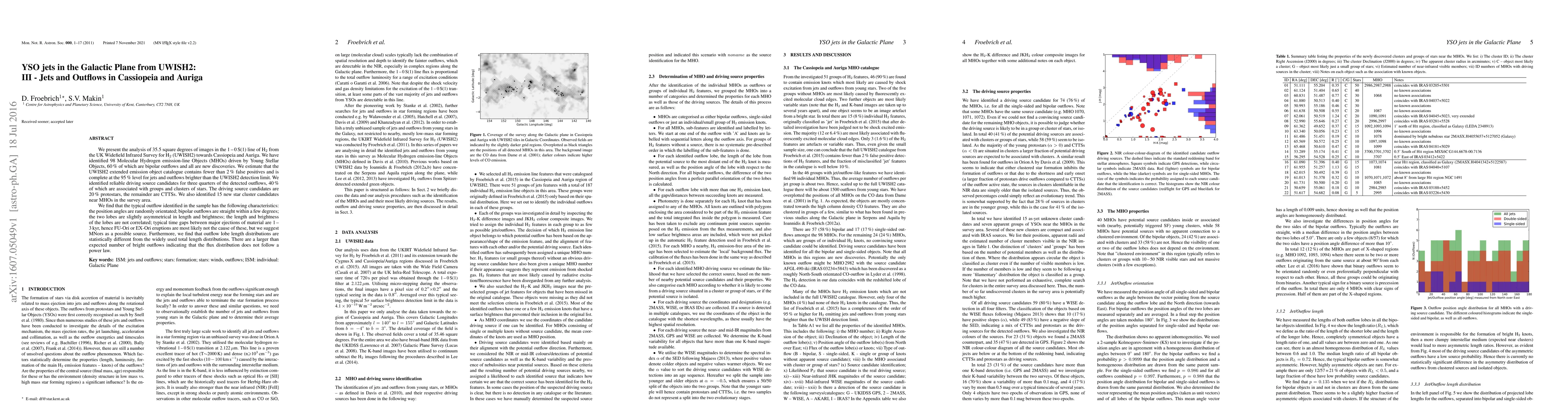 We present the analysis of 35.5 square degrees of images in the 1-0S(1) line of H2 from the UK Widefield Infrared Survey for H2 (UWISH2) towards Cassiopeia and Auriga. We have identified 98 Molecular Hydrogen emission-line Objects (MHOs) driven by Young Stellar Objects, 60% of which are bipolar outflows and all are new discoveries. We estimate that the UWISH2 extended emission object catalogue contains fewer than % false positives and is complete at the 95% level for jets and outflows brighter than the UWISH2 detection limit. We identified reliable driving source candidates for three quarters of the detected outflows, 40% of which are associated with groups and clusters of stars. The driving source candidates are 20% protostars, the remainder are CTTSs. We also identified 15 new star cluster candidates near MHOs in the survey area. We find that the typical outflow identified in the sample has the following characteristics: the position angles are randomly orientated; bipolar outflows are straight within a few degrees; the two lobes are slightly asymmetrical in length and brightness; the length and brightness of the lobes are not correlated; typical time gaps between major ejections of material are 1-3kyr, hence FU-Ori or EX-Ori eruptions are most likely not the cause of these, but we suggest MNors as a possible source. Furthermore, we find that outflow lobe length distributions are statistically different from the widely used total length distributions. There are a larger than expected number of bright outflows indicating that the flux distribution does not follow a power law.