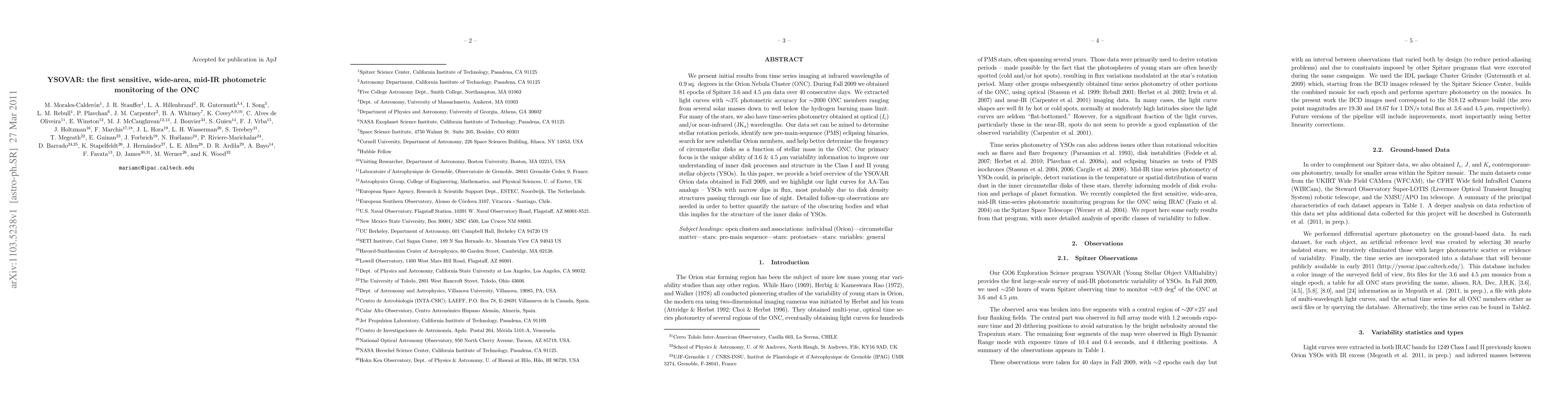 We present initial results from time series imaging at infrared wavelengths of 0.9 sq. degrees in the Orion Nebula Cluster (ONC). During Fall 2009 we obtained 81 epochs of Spitzer 3.6 and 4.5 micron data over 40 consecutive days. We extracted light curves with ~3% photometric accuracy for ~2000 ONC members ranging from several solar masses down to well below the hydrogen burning mass limit. For many of the stars, we also have time-series photometry obtained at optical (Ic) and/or near-infrared (JKs) wavelengths. Our data set can be mined to determine stellar rotation periods, identify new pre-main-sequence (PMS) eclipsing binaries, search for new substellar Orion members, and help better determine the frequency of circumstellar disks as a function of stellar mass in the ONC. Our primary focus is the unique ability of 3.6 & 4.5 micron variability information to improve our understanding of inner disk processes and structure in the Class I and II young stellar objects (YSOs). In this paper, we provide a brief overview of the YSOVAR Orion data obtained in Fall 2009, and we highlight our light curves for AA-Tau analogs - YSOs with narrow dips in flux, most probably due to disk density structures passing through our line of sight. Detailed follow-up observations are needed in order to better quantify the nature of the obscuring bodies and what this implies for the structure of the inner disks of YSOs.