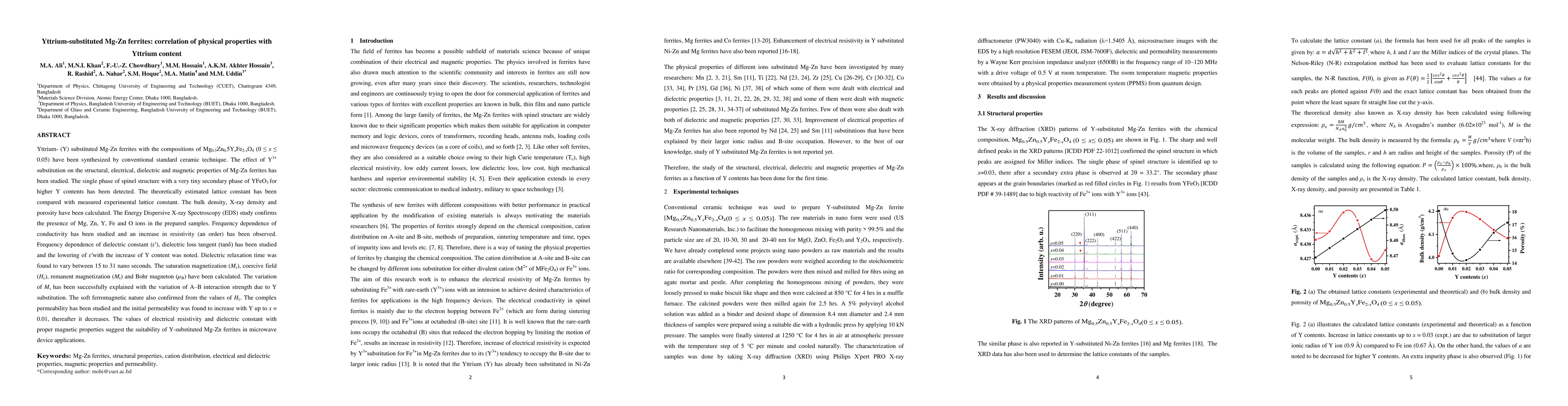 This study investigates the impact of yttrium substitution on the structural, electrical, dielectric, and magnetic properties of Mg-Zn ferrites synthesized via conventional ceramic techniques. The results reveal significant correlations between yttrium content and the material's physical properties.