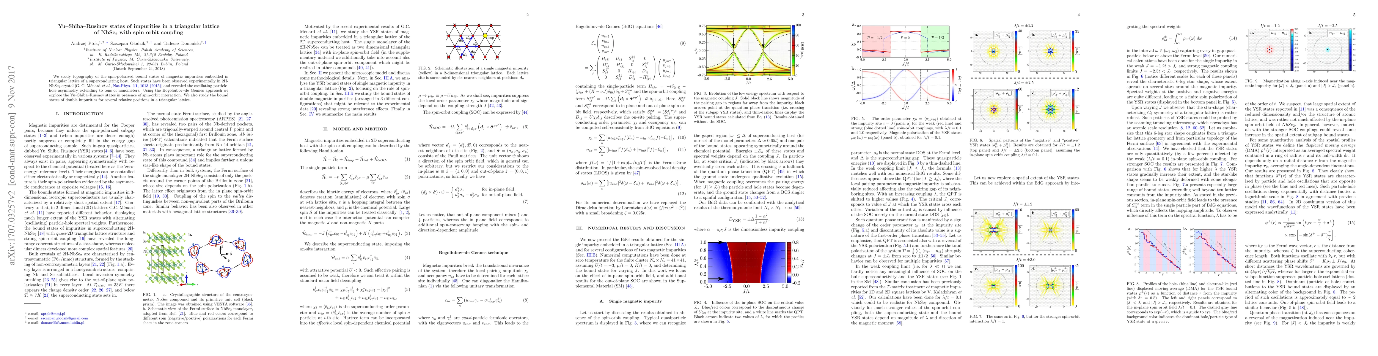 We study topography of the spin-polarized bound states of magnetic impurities embedded in triangular lattice of a superconducting host. Such states have been observed experimentally in 2H-NbSe$_{2}$ crystal [G. C. M'enard et al., Nat.Phys. 11, 1013 (2015)] and revealed the oscillating particle-hole asymmetry extending to tens of nanometers. Using the Bogoliubov-de Gennes approach we explore the Yu-Shiba-Rusinov states in presence of spin-orbit interaction. We also study the bound states of double impurities for several relative positions in a triangular lattice.