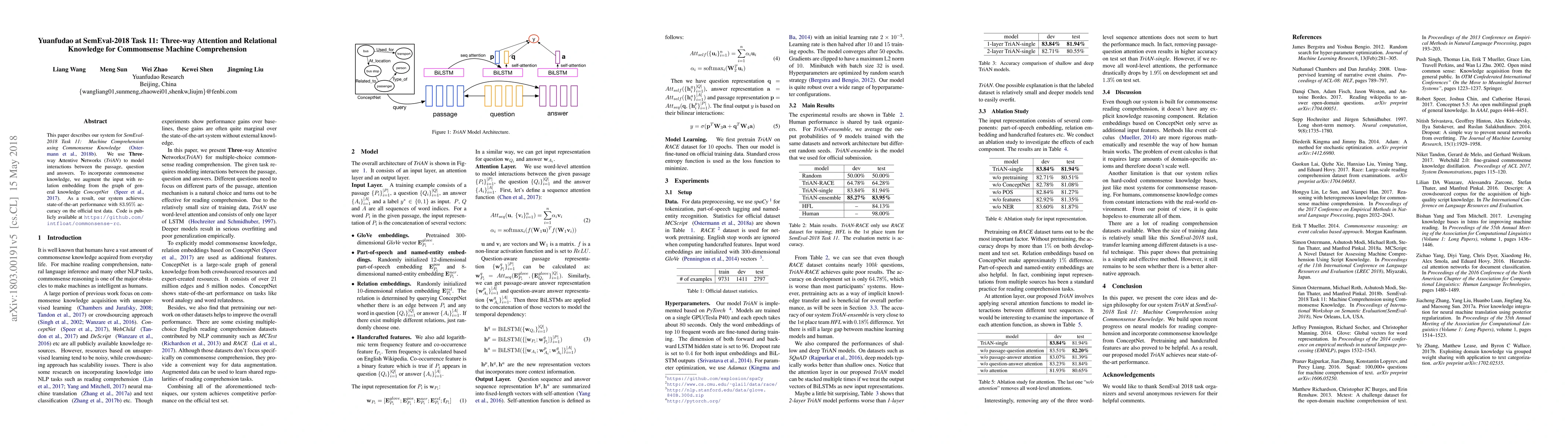This paper details Yuanfudao's approach for SemEval-2018 Task 11 using TriAN to model interactions among passage, question, and answers, augmented with ConceptNet relational knowledge, achieving top performance with 83.95% accuracy. Code is publicly accessible for further exploration.