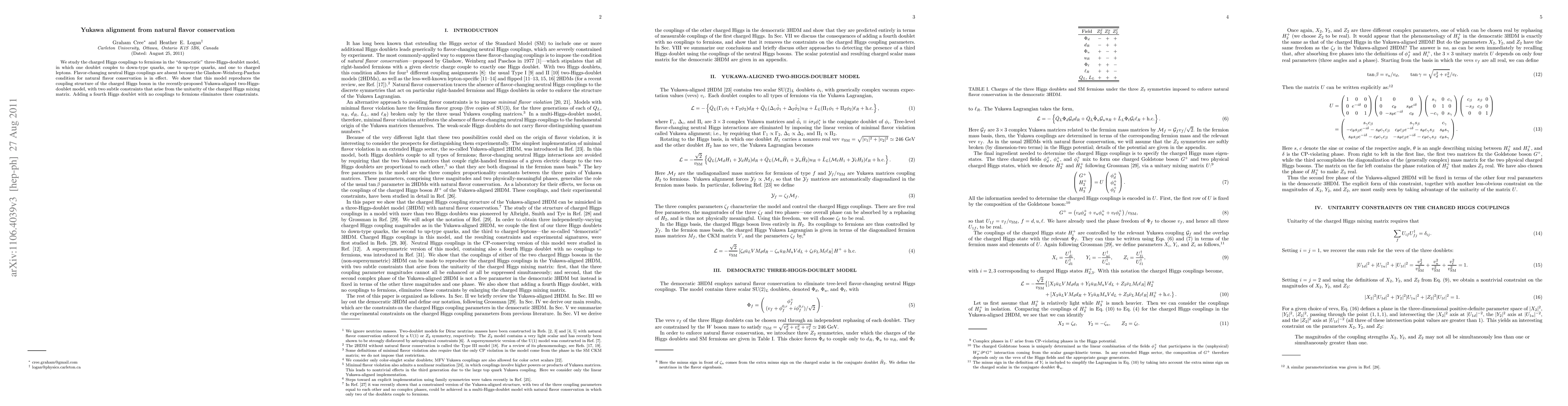 We study the charged Higgs couplings to fermions in the "democratic" three-Higgs-doublet model, in which one doublet couples to down-type quarks, one to up-type quarks, and one to charged leptons. Flavor-changing neutral Higgs couplings are absent because the Glashow-Weinberg-Paschos condition for natural flavor conservation is in effect. We show that this model reproduces the coupling structure of the charged Higgs boson in the recently-proposed Yukawa-aligned two-Higgs-doublet model, with two subtle constraints that arise from the unitarity of the charged Higgs mixing matrix. Adding a fourth Higgs doublet with no couplings to fermions eliminates these constraints.