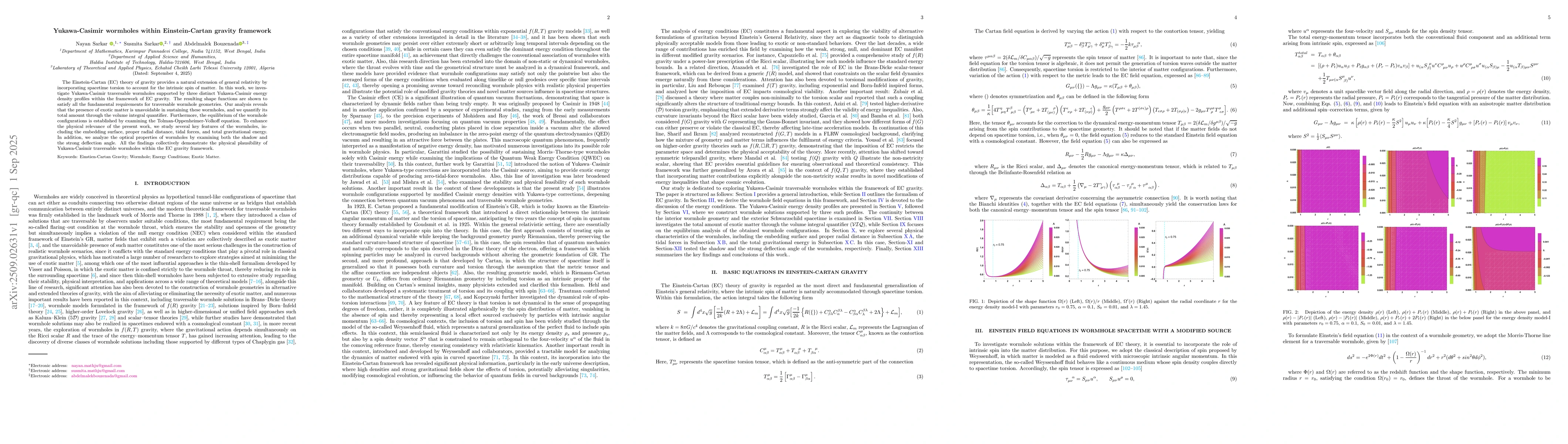 The Einstein-Cartan (EC) theory of gravity provides a natural extension of general relativity by incorporating spacetime torsion to account for the intrinsic spin of matter. In this work, we investigate Yukawa-Casimir traversable wormholes supported by three distinct Yukawa-Casimir energy density profiles within the framework of EC gravity. The resulting shape functions are shown to satisfy all the fundamental requirements for traversable wormhole geometries. Our analysis reveals that the presence of exotic matter is unavoidable in sustaining these wormholes, and we quantify its total amount through the volume integral quantifier. Furthermore, the equilibrium of the wormhole configurations is established by examining the Tolman-Oppenheimer-Volkoff equation. To enhance the physical relevance of the present work, we study several key features of the wormholes, including the embedding surface, proper radial distance, tidal forces, and total gravitational energy. In addition, we analyze the optical properties of wormholes by examining both the shadow and the strong deflection angle. All the findings collectively demonstrate the physical plausibility of Yukawa-Casimir traversable wormholes within the EC gravity framework.
