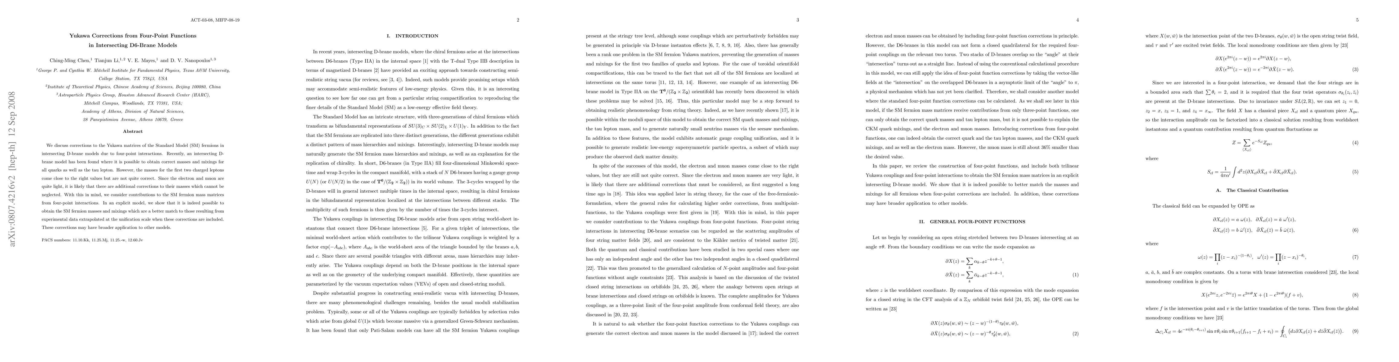 We discuss corrections to the Yukawa matrices of the Standard Model (SM) fermions in intersecting D-brane models due to four-point interactions. Recently, an intersecting D-brane model has been found where it is possible to obtain correct masses and mixings for all quarks as well as the tau lepton. However, the masses for the first two charged leptons come close to the right values but are not quite correct. Since the electron and muon are quite light, it is likely that there are additional corrections to their masses which cannot be neglected. With this in mind, we consider contributions to the SM fermion mass matrices from four-point interactions. In an explicit model, we show that it is indeed possible to obtain the SM fermion masses and mixings which are a better match to those resulting from experimental data extrapolated at the unification scale when these corrections are included. These corrections may have broader application to other models.