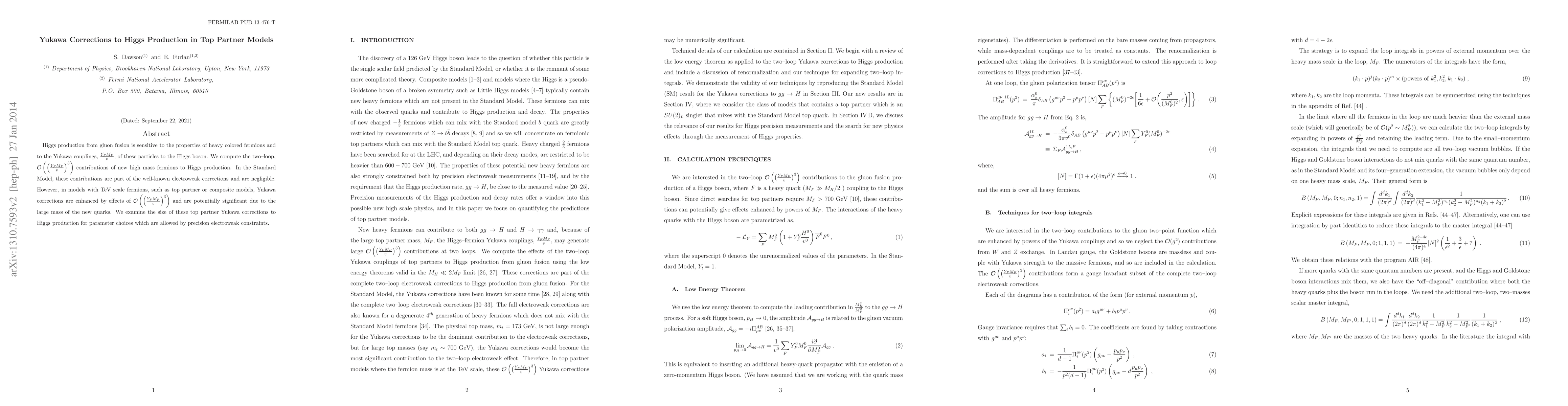 Higgs production from gluon fusion is sensitive to the properties of heavy colored fermions and to the Yukawa couplings, (Y_F M_F)/v, of these particles to the Higgs boson. We compute the two--loop, ${\cal O}((Y_F M_F)^3/v^3)$ contributions of new high mass fermions to Higgs production. In the Standard Model, these contributions are part of the well-known electroweak corrections and are negligible. However, in models with TeV scale fermions, such as top partner or composite models, Yukawa corrections are enhanced by effects of ${\cal O}((Y_F M_F)^3/v^3)$ and are potentially significant due to the large mass of the new quarks. We examine the size of these top partner Yukawa corrections to Higgs production for parameter choices which are allowed by precision electroweak constraints.