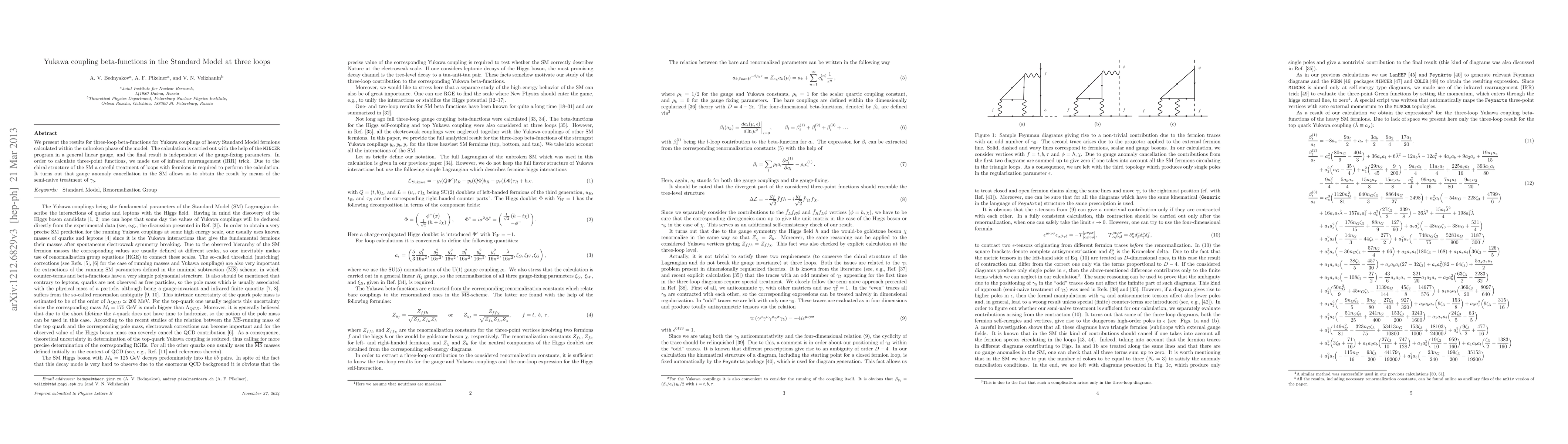 We present the results for three-loop beta-functions for Yukawa couplings of heavy Standard Model fermions calculated within the unbroken phase of the model. The calculation is carried out with the help of the MINCER program in a general linear gauge, and the final result is independent of the gauge-fixing parameters. In order to calculate three-point functions, we made use of infrared rearrangement (IRR) trick. Due to the chiral structure of the SM a careful treatment of loops with fermions is required to perform the calculation. It turns out that gauge anomaly cancellation in the SM allows us to obtain the result by means of the semi-naive treatment of gamma5.