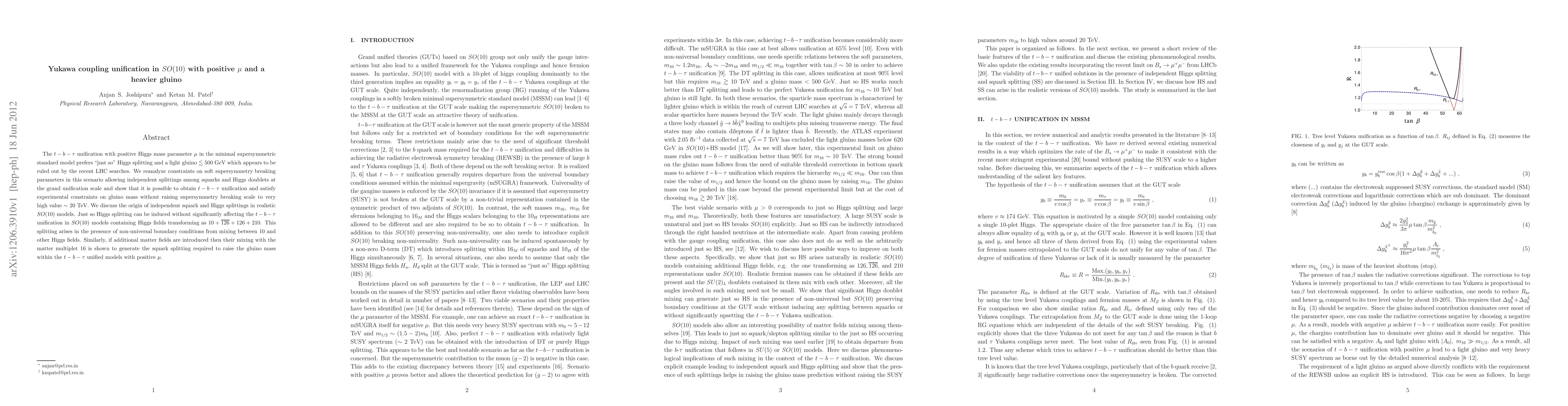 This paper explores Yukawa coupling unification in SO(10) models under the condition of positive Higgs mass parameter \mu\ while maintaining a heavier gluino. It demonstrates that independent squark and Higgs splittings can achieve t-b-tau unification without necessitating a high supersymmetry breaking scale, thus reconciling recent LHC constraints.