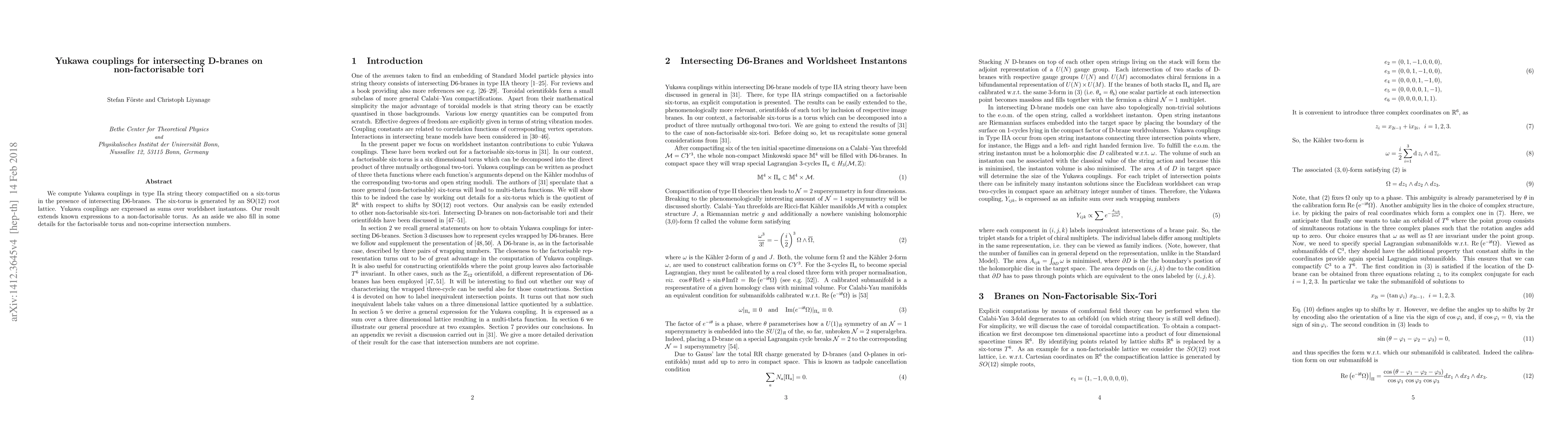 This paper computes Yukawa couplings in type IIa string theory on a non-factorisable six-torus generated by an SO(12) root lattice, considering intersecting D6-branes. The results extend previous findings to non-factorisable tori and include details for factorisable tori and non-coprime intersection numbers.