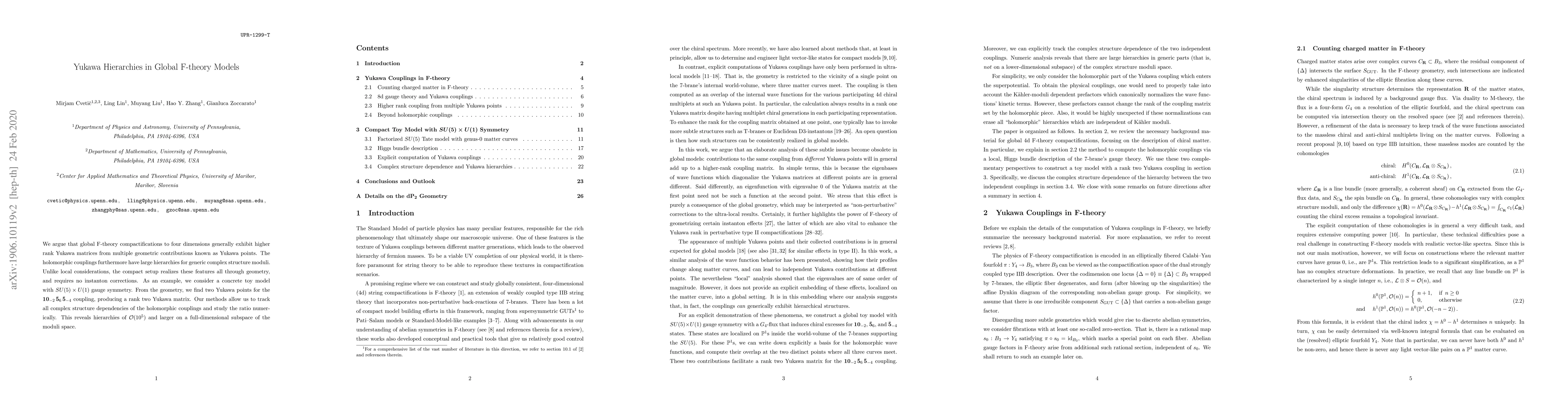 We argue that global F-theory compactifications to four dimensions generally exhibit higher rank Yukawa matrices from multiple geometric contributions known as Yukawa points. The holomorphic couplings furthermore have large hierarchies for generic complex structure moduli. Unlike local considerations, the compact setup realizes these features all through geometry, and requires no instanton corrections. As an example, we consider a concrete toy model with $SU(5) \times U(1)$ gauge symmetry. From the geometry, we find two Yukawa points for the ${\bf 10}_{-2} \, \bar{\bf 5}_6 \, \bar{\bf 5}_{-4}$ coupling, producing a rank two Yukawa matrix. Our methods allow us to track all complex structure dependencies of the holomorphic couplings and study the ratio numerically. This reveals hierarchies of ${\cal O}(10^5)$ and larger on a full-dimensional subspace of the moduli space.