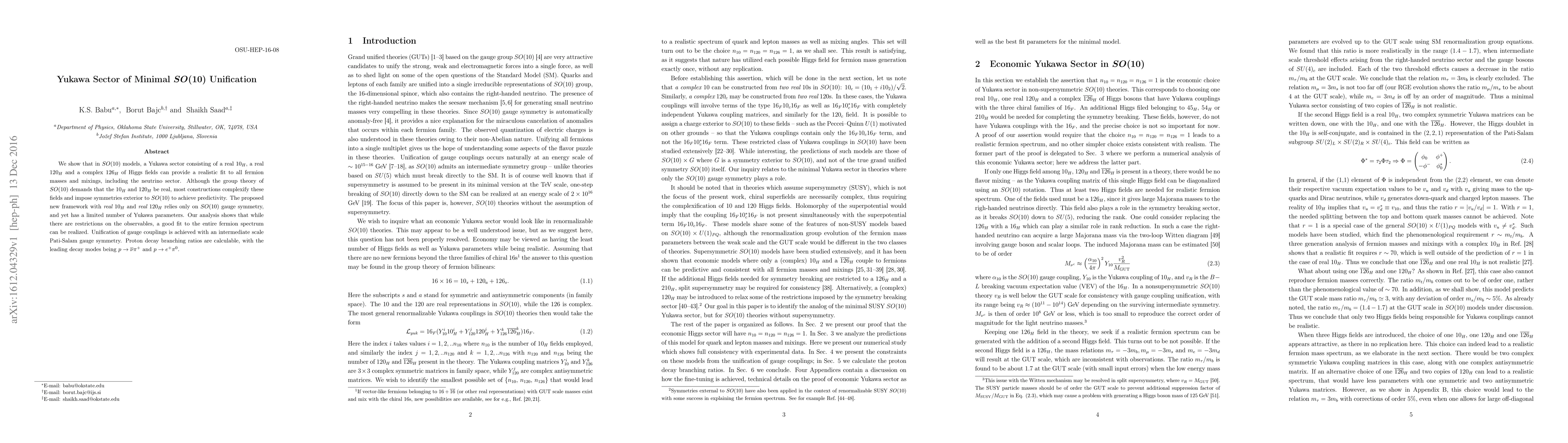 This paper proposes a Yukawa sector in SO(10) unification using real Higgs fields $10_H$ and $120_H$ along with a complex $126_H$, achieving a realistic fit for all fermion masses and mixings, including the neutrino sector, while maintaining SO(10) gauge symmetry. Proton decay branching ratios are also calculable within this framework.