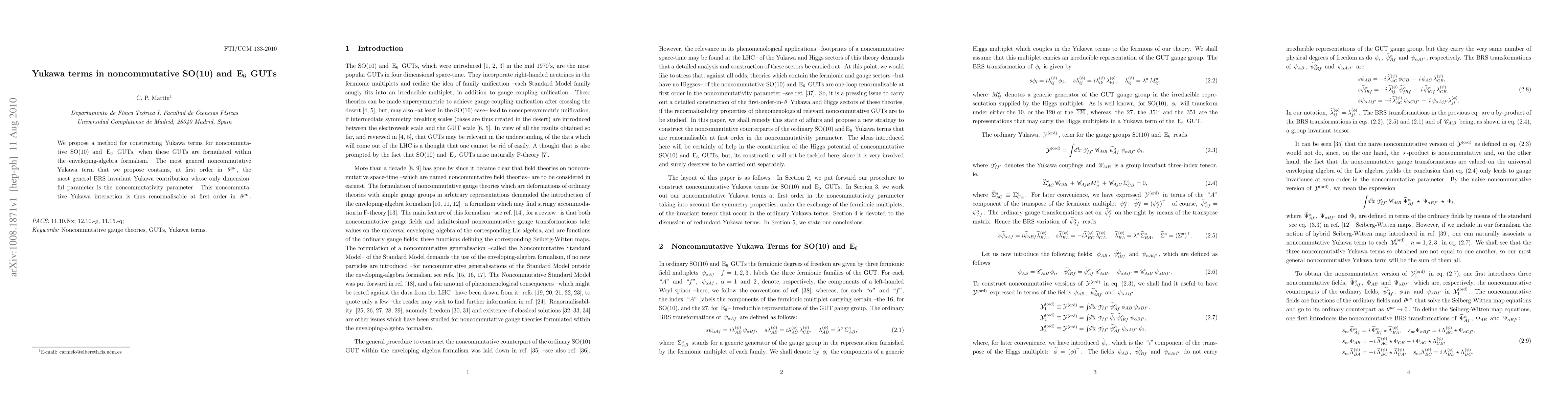 We propose a method for constructing Yukawa terms for noncommutative SO(10) and E6 GUTs, when these GUTs are formulated within the enveloping-algebra formalism. The most general noncommutative Yukawa term that we propose contains, at first order in thetamunu, the most general BRS invariant Yukawa contribution whose only dimensionful parameter is the noncommutativity parameter. This noncommutative Yukawa interaction is thus renormalisable at first order in thetamunu.