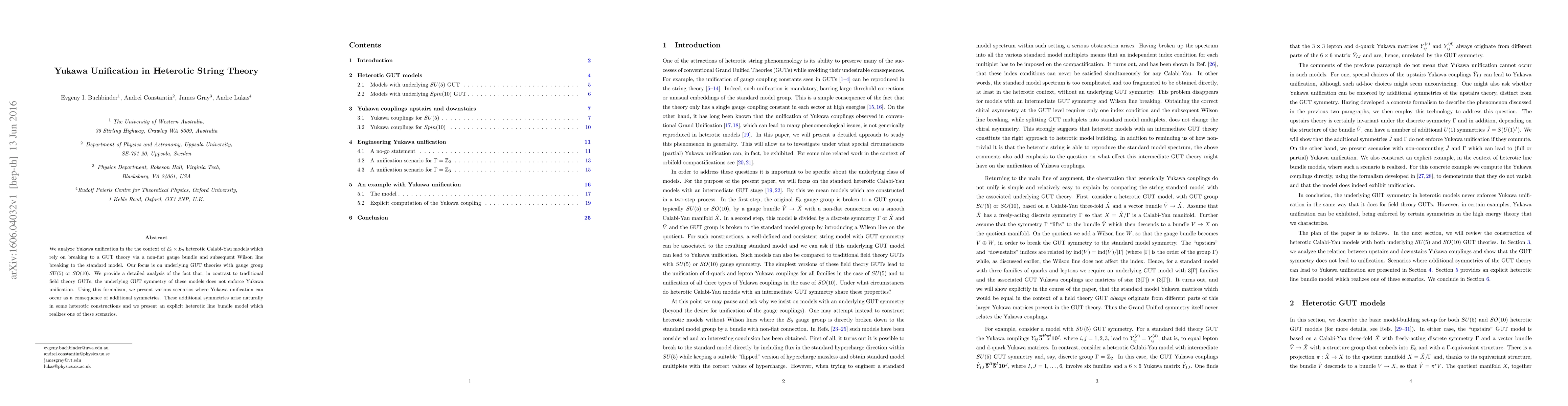 This paper explores Yukawa unification in heterotic string theory within $E_8\times E_8$ Calabi-Yau models, revealing that traditional GUT symmetry does not enforce Yukawa unification. It presents scenarios where Yukawa unification emerges from additional symmetries naturally occurring in certain heterotic constructions.