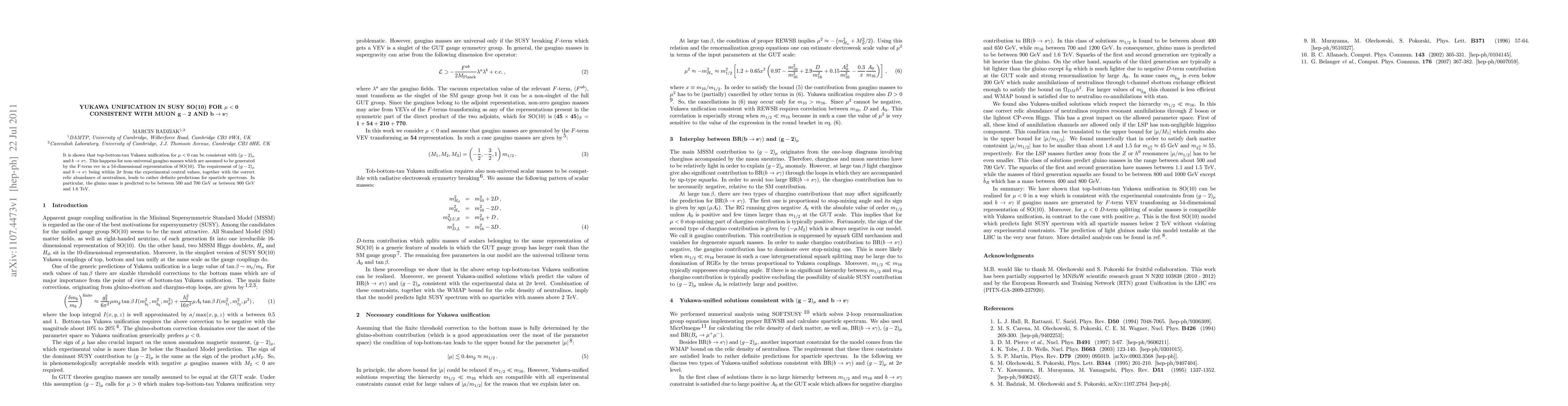This paper demonstrates that Yukawa unification in SUSY SO(10) with \mu<0 can reconcile top-bottom-tau Yukawa coupling consistency with muon g-2 and b->s gamma measurements. Non-universal gaugino masses generated via F-term vev in a 54-dimensional SO(10) representation lead to specific sparticle mass predictions, notably gluino masses between 500-700 GeV or 900-1600 GeV.