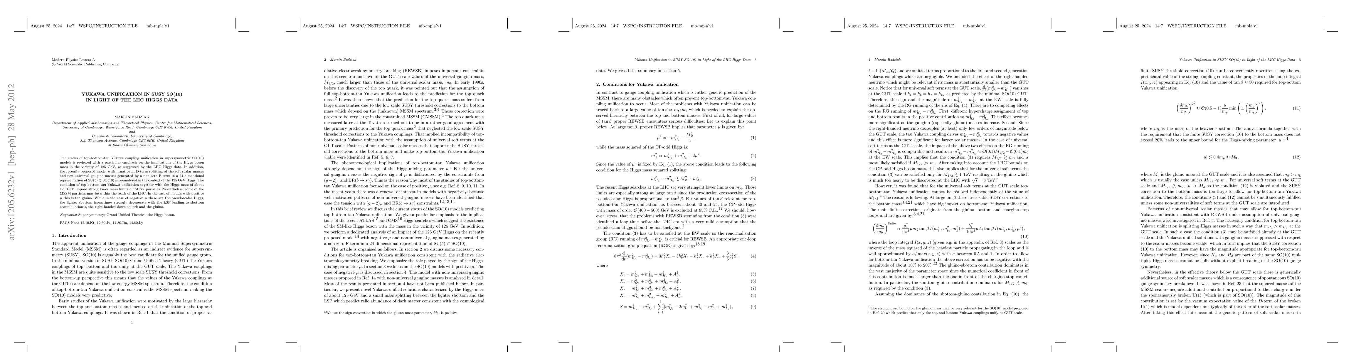 This paper reviews top-bottom-tau Yukawa coupling unification in supersymmetric SO(10) models, focusing on the implications of the 125 GeV Higgs mass from LHC data. It re-analyzes a model with negative \mu and finds that while SUSY particles generally have lower mass limits, certain MSSM particles could be within LHC detection range, notably the gluino for positive \mu and pseudoscalar Higgs, lighter sbottom, right-handed down squark, and gluino for negative \mu.