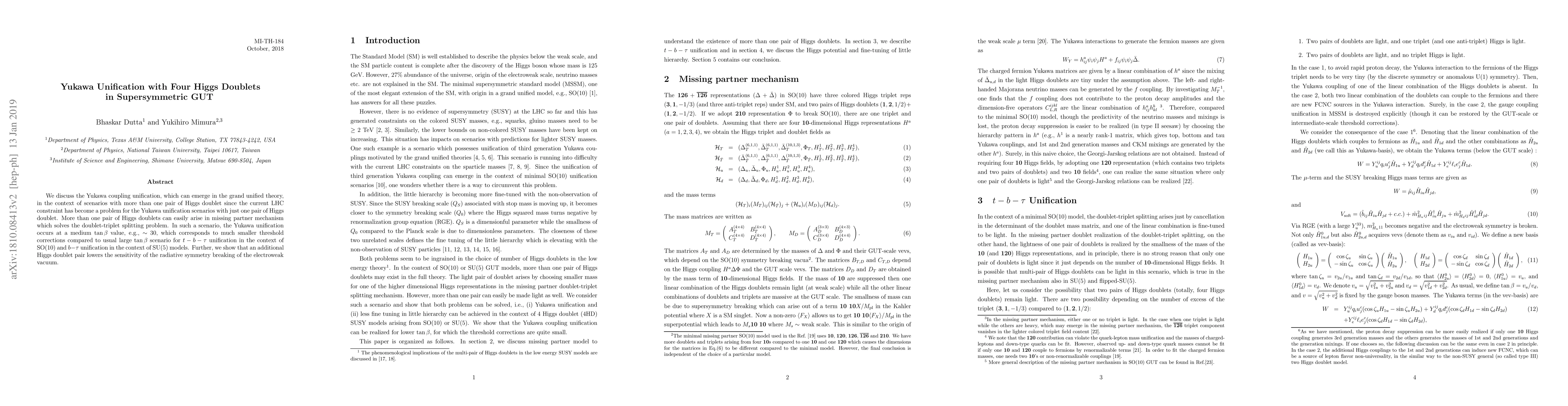We discuss the Yukawa coupling unification, a very interesting prediction of the grand unified theory, in the context of scenarios with more than one pair of Higgs doublet since the current LHC constraint has become a problem for the Yukawa unification scenarios with just one pair of Higgs doublet. More than one pair of Higgs doublets can easily arise in missing partner mechanism which solves the doublet-triplet splitting problem. In such a scenario, the Yukawa unification occurs at a medium $\tan\beta$ value, e.g., $\sim$ 30, which corresponds to much smaller threshold corrections compared to usual large $\tan\beta$ scenario for $t-b-\tau$ unification in the context of SO(10) and $b-\tau$ unification in the context of SU(5) models. Further, we show that an additional Higgs doublet pair lowers the sensitivity of the radiative symmetry breaking of the electroweak vacuum.