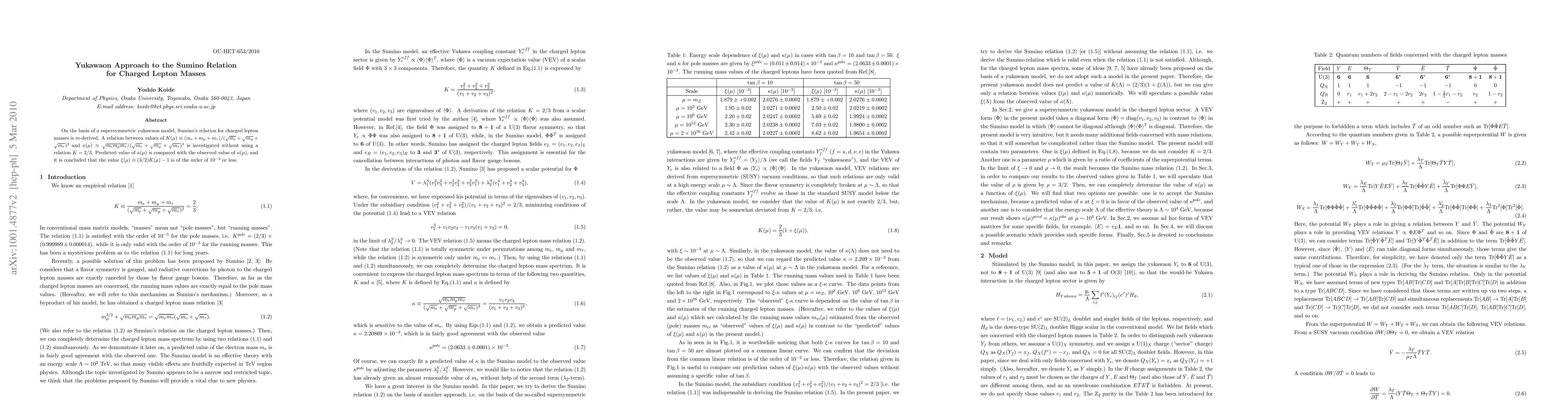 This paper re-derives Sumino's relation for charged lepton masses using a supersymmetric yukawaon model, exploring a new relation between $K(\mu)$ and $\kappa(\mu)$ without assuming $K=2/3$. The predicted $\kappa(\mu)$ value is found to be consistent with observations, indicating $\xi(\mu)$ is small, around $10^{-3}$ or less.