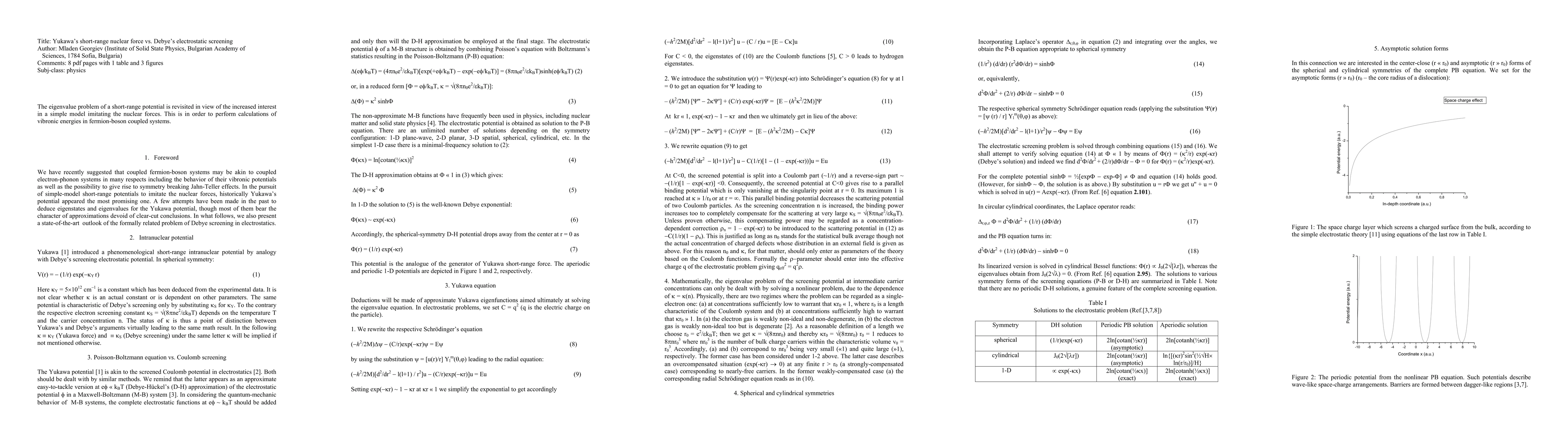 The eigenvalue problem of a short-range potential is revisited in view of the increased interest in simple models imitating the nuclear forces. This is in order to conduct calculations of vibronic energies in fermion-boson coupled systems.