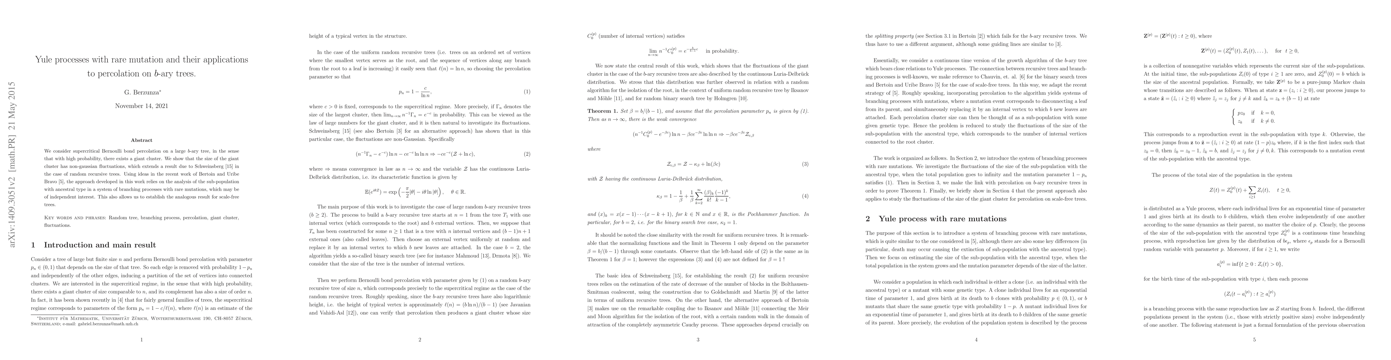 This paper investigates supercritical Bernoulli bond percolation on large $b$-ary trees, demonstrating non-Gaussian fluctuations in the size of the giant cluster. It employs branching processes with rare mutations to extend results from random recursive trees to scale-free trees.