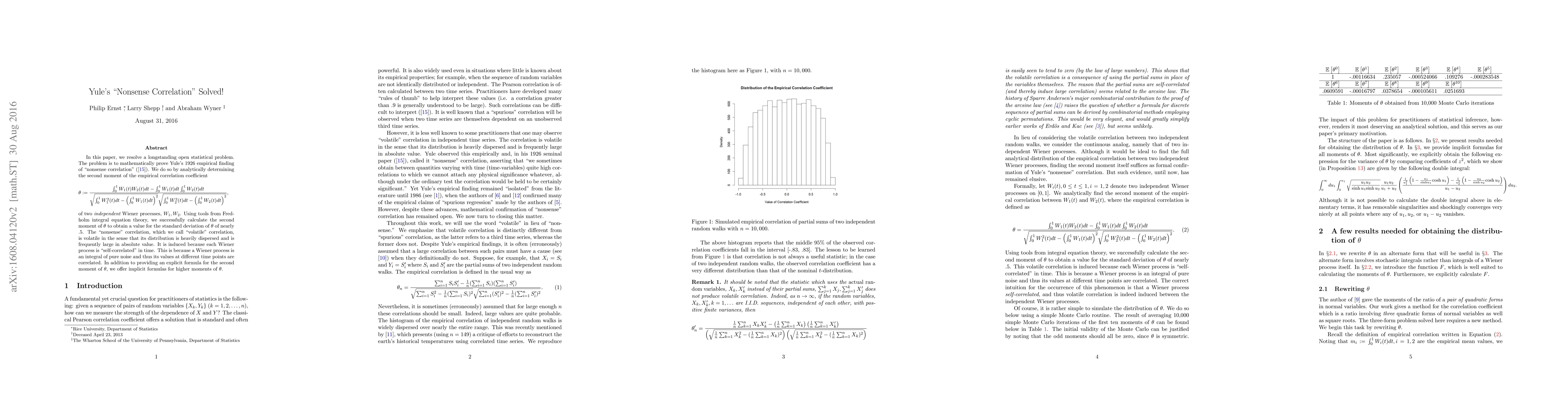 The paper resolves Yule's 1926 'nonsense correlation' problem by analytically determining the second moment of the empirical correlation coefficient between two independent Wiener processes, using Fredholm integral equation theory.