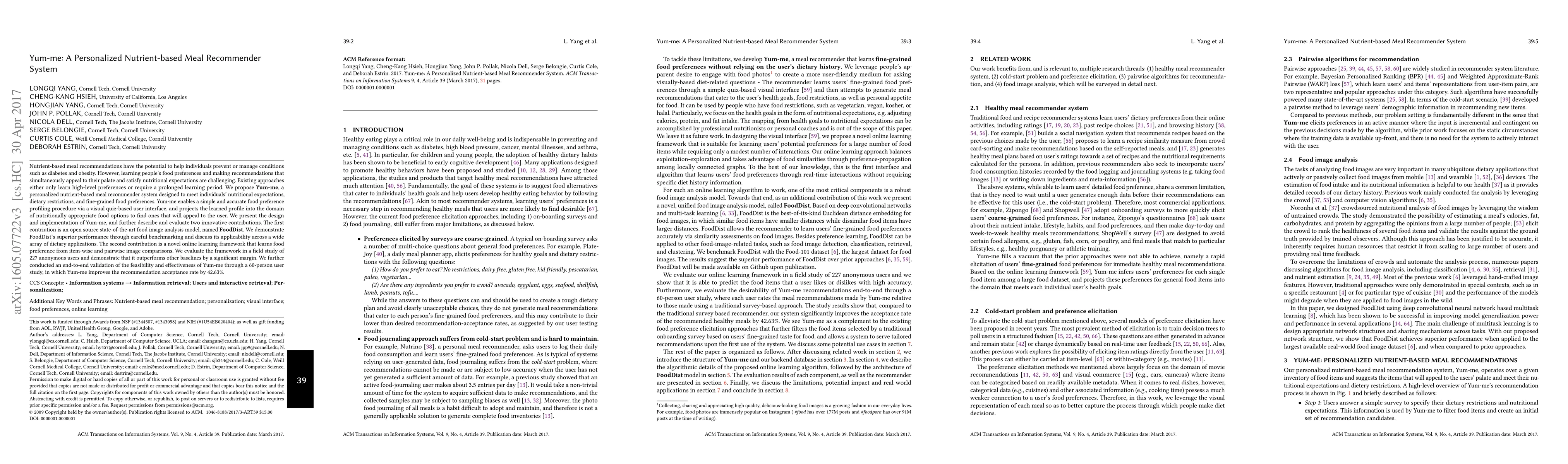 Yum-me is a personalized meal recommender system that integrates nutrient-based recommendations with user-specific food preferences. It employs a visual quiz interface and an advanced food image analysis model, FoodDist, to enhance recommendation accuracy and acceptance.