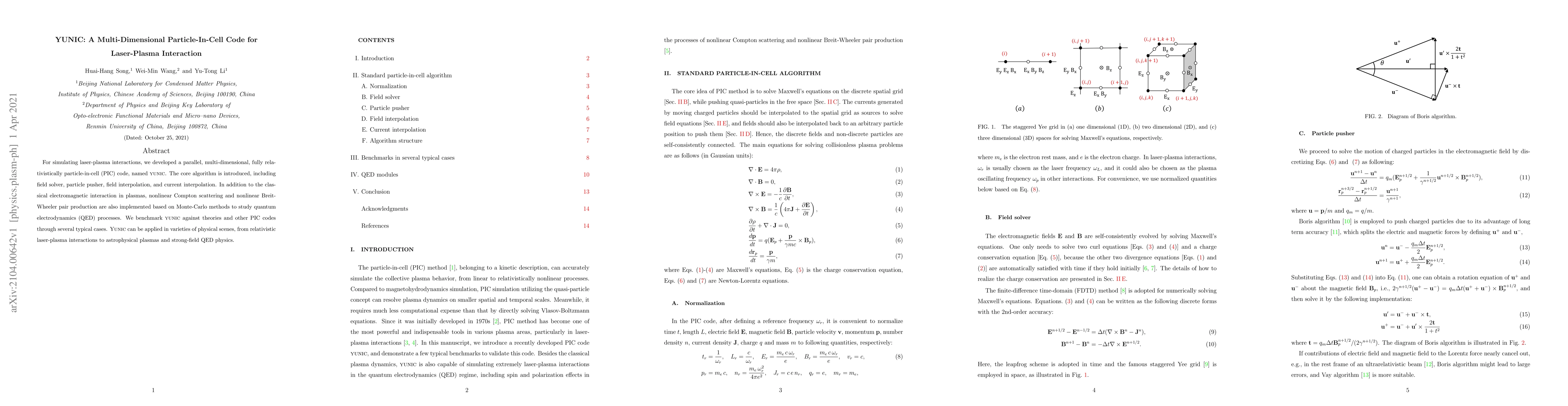 YUNIC is a parallel, multi-dimensional, fully relativistic particle-in-cell code for simulating laser-plasma interactions, including advanced QED processes like nonlinear Compton scattering and pair production. It is benchmarked against other methods and applicable to a range of physical scenarios.