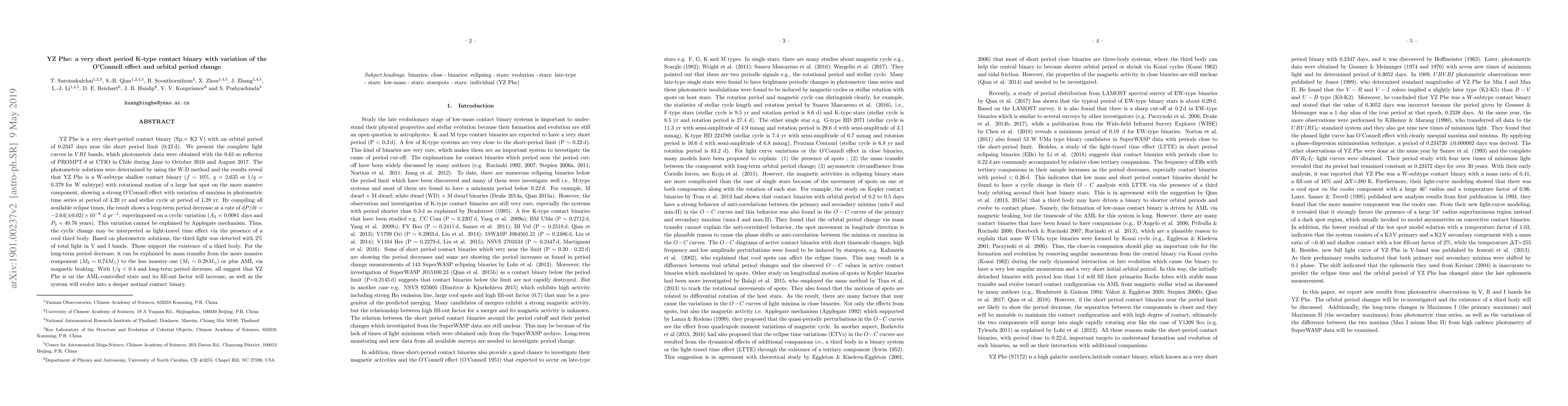 YZ Phe is a short-period contact binary exhibiting a strong O'Connell effect and a long-term orbital period decrease, likely due to mass transfer or magnetic braking. The presence of a third body is inferred from the detected third light contribution and cyclic variation in period.