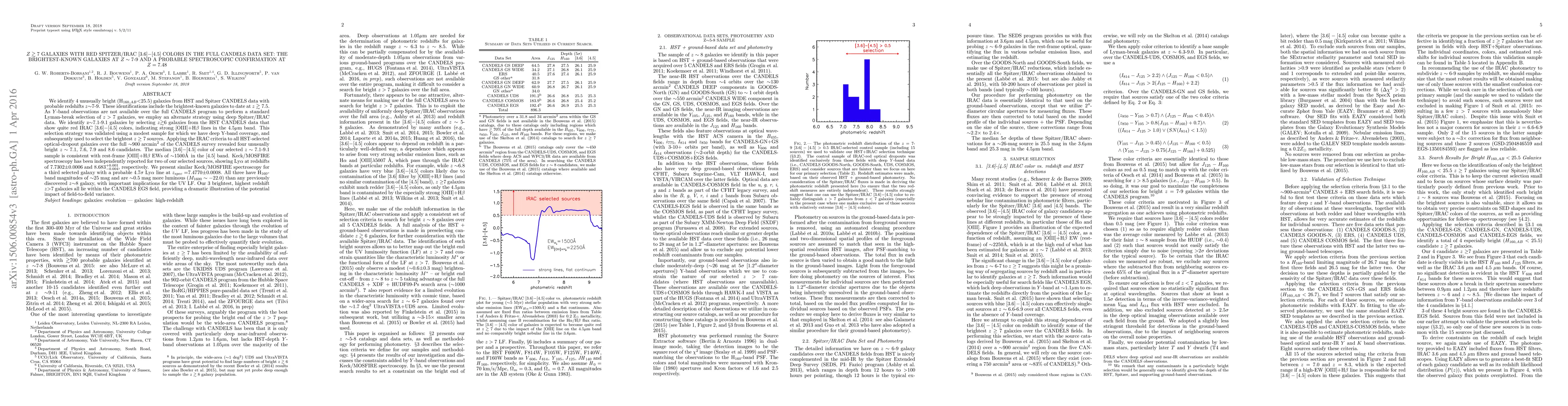 This paper identifies four exceptionally bright galaxies at redshifts z ~ 7-9 using deep Spitzer/IRAC data from the CANDELS survey, marking the brightest known at z > 7.5. Spectroscopic confirmation via Keck/MOSFIRE supports the redshifts for three of these galaxies, highlighting significant implications for the ultraviolet luminosity function.