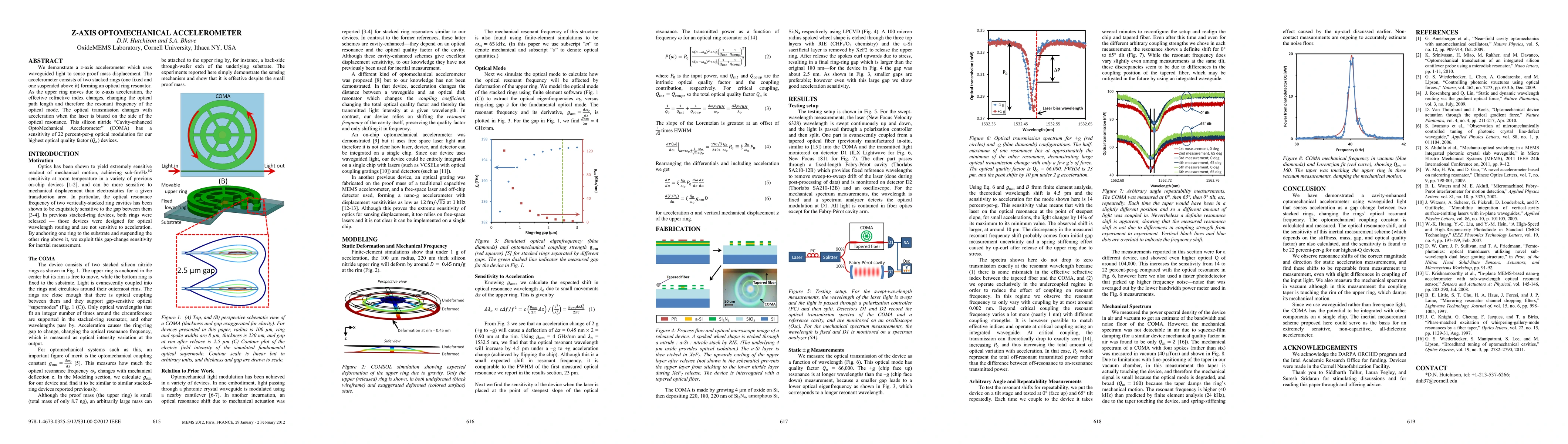 This paper presents a z-axis accelerometer utilizing waveguided light to detect proof mass displacement via an optical ring resonator. The device's sensitivity reaches 22 percent-per-g optical modulation, demonstrating the potential of silicon nitride "Cavity-enhanced OptoMechanical Accelerometer" (COMA) for precise acceleration sensing.