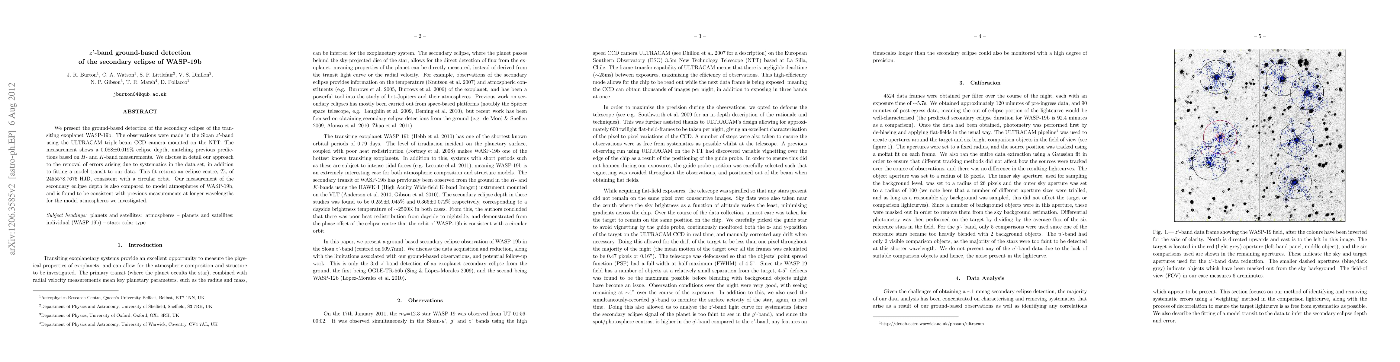 We present the ground-based detection of the secondary eclipse of the transiting exoplanet WASP-19b. The observations were made in the Sloan z'-band using the ULTRACAM triple-beam CCD camera mounted on the NTT. The measurement shows a 0.088\pm0.019% eclipse depth, matching previous predictions based on H- and K-band measurements. We discuss in detail our approach to the removal of errors arising due to systematics in the data set, in addition to fitting a model transit to our data. This fit returns an eclipse centre, T0, of 2455578.7676 HJD, consistent with a circular orbit. Our measurement of the secondary eclipse depth is also compared to model atmospheres of WASP-19b, and is found to be consistent with previous measurements at longer wavelengths for the model atmospheres we investigated.