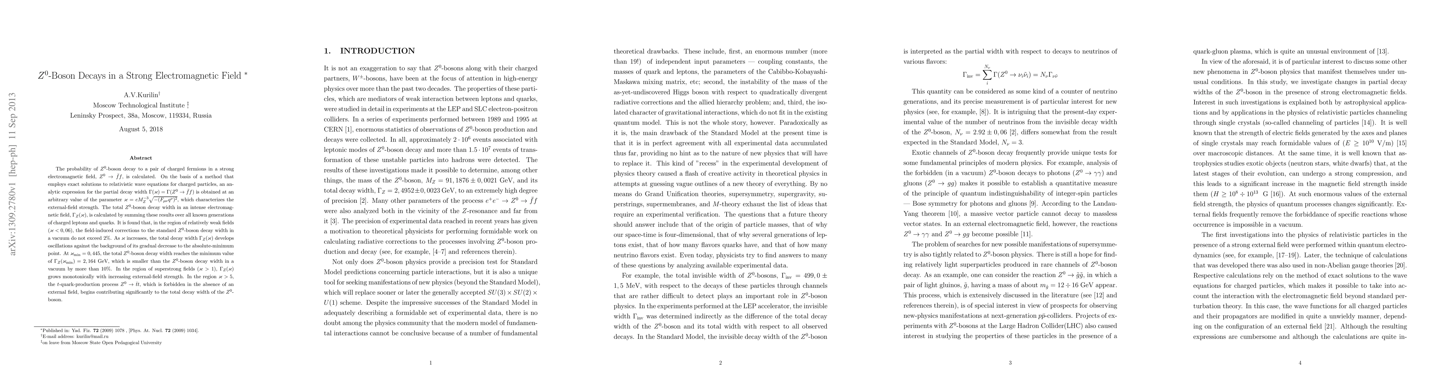 Researchers calculated the probability of Z-boson decay in strong electromagnetic fields, finding that field-induced corrections only affect weak-field cases by 2% or less, with total widths increasing monotonically in stronger fields.
