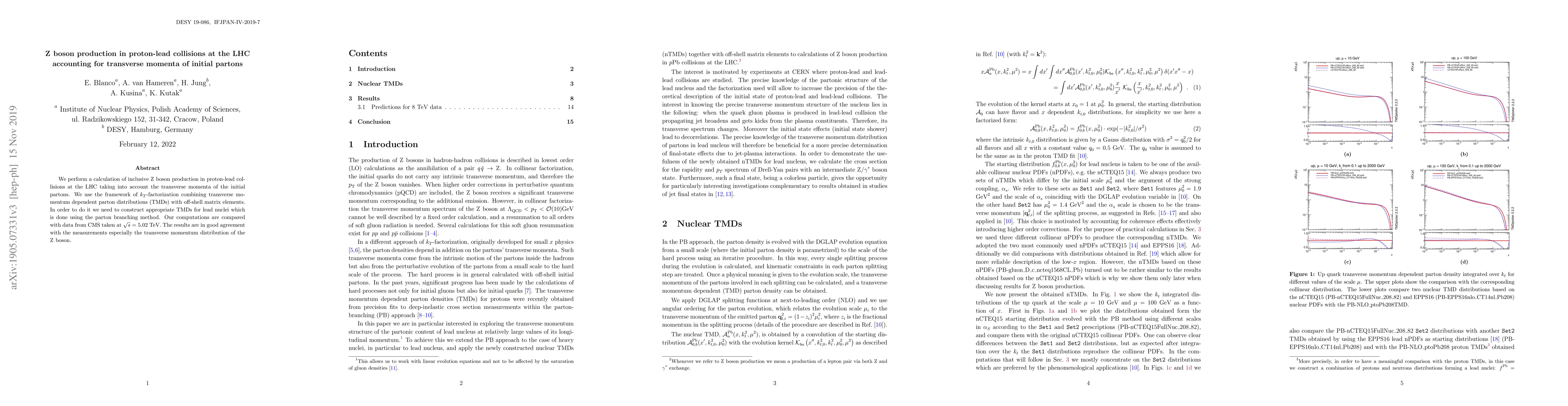 This paper investigates $Z$ boson production in proton-lead collisions at the LHC using $k_T$-factorization with TMDs, focusing on the initial partons' transverse momenta. The study constructs TMDs for lead nuclei via the parton branching method and finds good agreement between the theoretical results and CMS data at $\sqrt{s}=5.02$ TeV.
