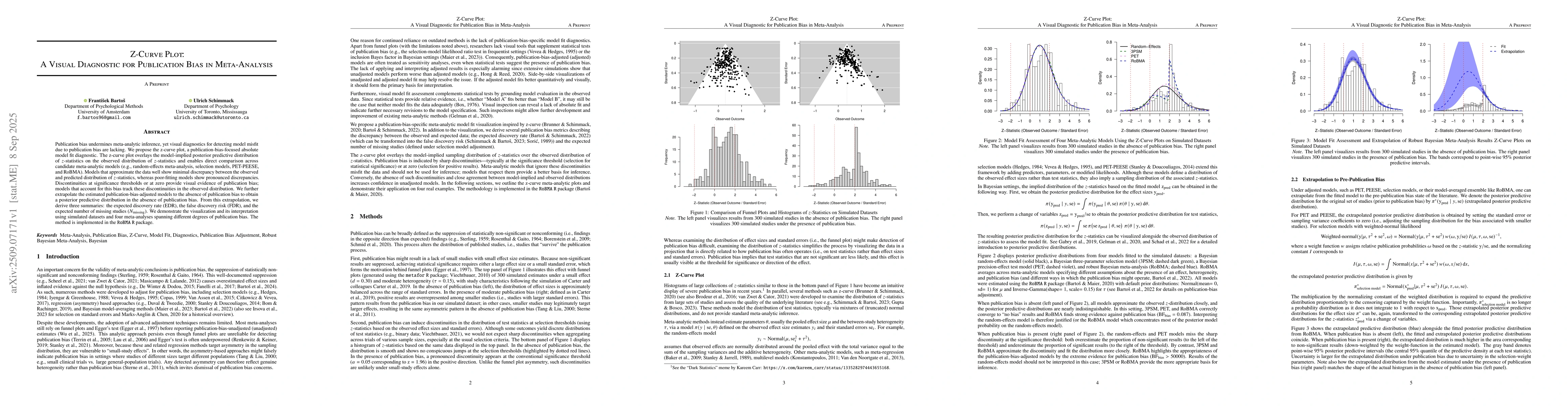 Publication bias undermines meta-analytic inference, yet visual diagnostics for detecting model misfit due to publication bias are lacking. We propose the z-curve plot, a publication-bias-focused absolute model fit diagnostic. The z-curve plot overlays the model-implied posterior predictive distribution of $z$-statistics on the observed distribution of z-statistics and enables direct comparison across candidate meta-analytic models (e.g., random-effects meta-analysis, selection models, PET-PEESE, and RoBMA). Models that approximate the data well show minimal discrepancy between the observed and predicted distribution of z-statistics, whereas poor-fitting models show pronounced discrepancies. Discontinuities at significance thresholds or at zero provide visual evidence of publication bias; models that account for this bias track these discontinuities in the observed distribution. We further extrapolate the estimated publication-bias-adjusted models to the absence of publication bias to obtain a posterior predictive distribution in the absence of publication bias. From this extrapolation, we derive three summaries: the expected discovery rate (EDR), the false discovery risk (FDR), and the expected number of missing studies (N missing). We demonstrate the visualization and its interpretation using simulated datasets and four meta-analyses spanning different degrees of publication bias. The method is implemented in the RoBMA R package.
