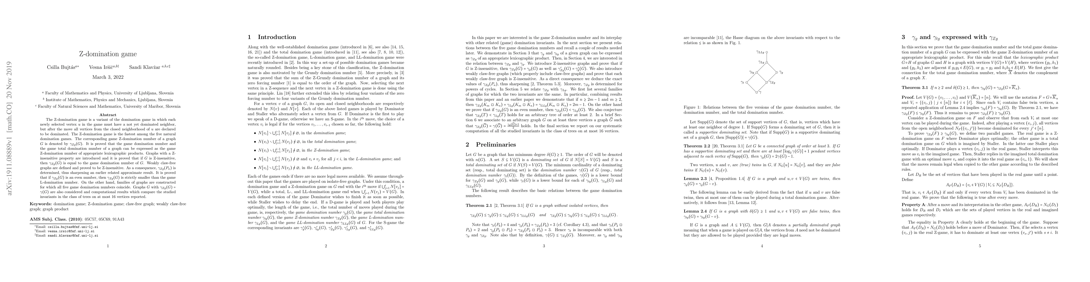 The Z-domination game is a variant of the domination game where each selected vertex must have an undominated neighbor, and its neighborhood becomes dominated afterward. The Z-domination number $\gamma_{Zg}(G)$ is the fastest among five natural domination games, and it relates to the game domination and game total domination numbers. Z-insensitive graphs have $\gamma_{Zg}(G)$ equal to their game domination number, with weakly claw-free graphs being an example of such graphs.