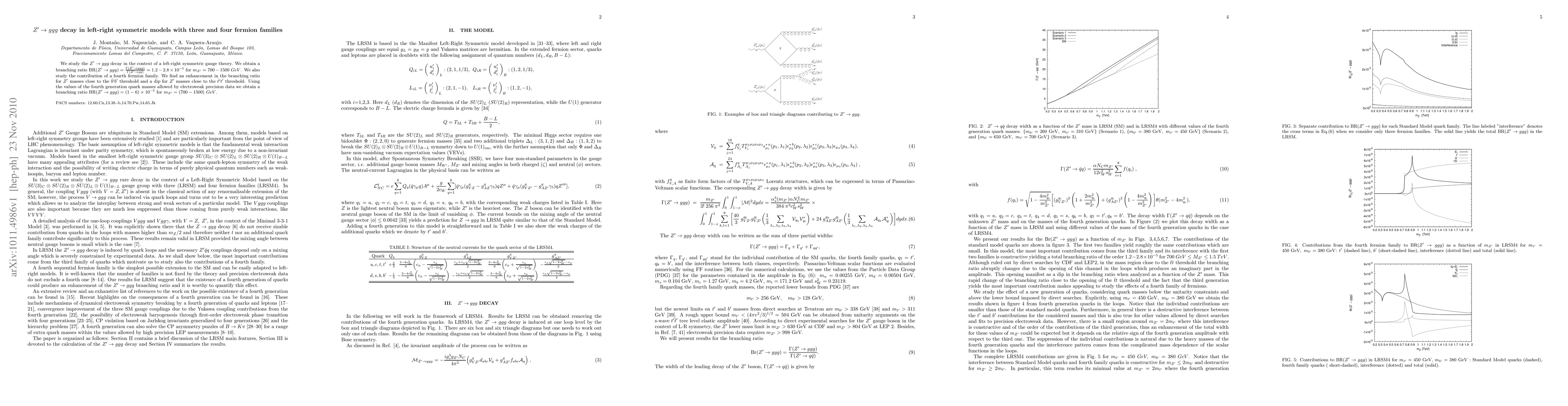 Researchers studied the Z'-> ggg decay in left-right symmetric models with 3-4 fermion families, finding a branching ratio of (1-6)x 10^{-5} for Z' masses between 700-1500 GeV, with peaks and dips near thresholds.