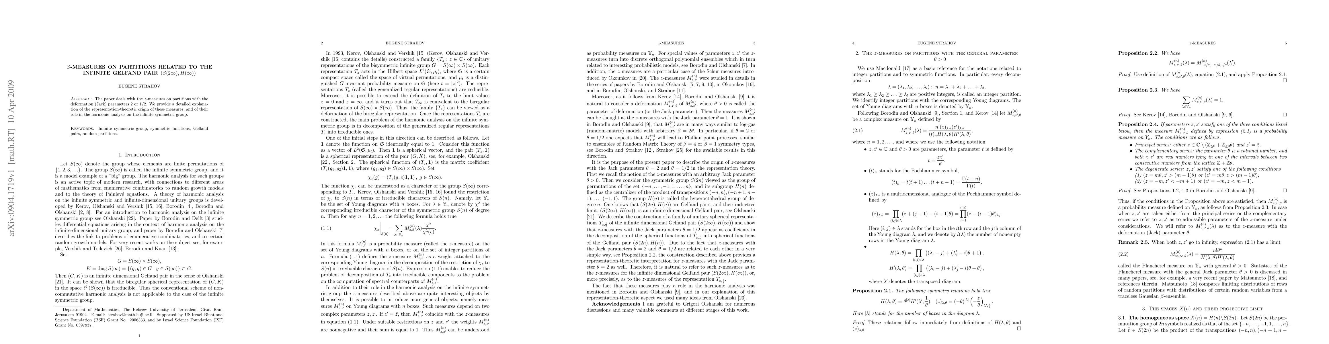 Summary: This paper explores z-measures on partitions associated with the infinite Gelfand pair $(S(2\infty),H(\infty))$, focusing on Jack parameters 2 and 1/2. It delves into the representation-theoretic origins of these measures and their significance in harmonic analysis on the infinite symmetric group.