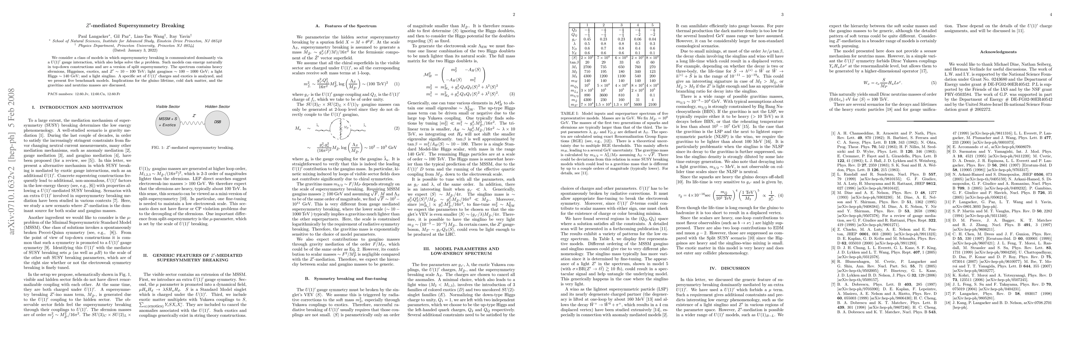 This paper explores models where supersymmetry breaking is primarily mediated by a U'(1) gauge interaction, addressing the \mu problem and proposing a version of split supersymmetry. It presents five benchmark models with a spectrum featuring heavy sfermions, Higgsinos, and Z' bosons, alongside lighter gauginos, a light Higgs, and a singlino, and discusses implications for gluino lifetime, dark matter, and gravitino and neutrino masses.