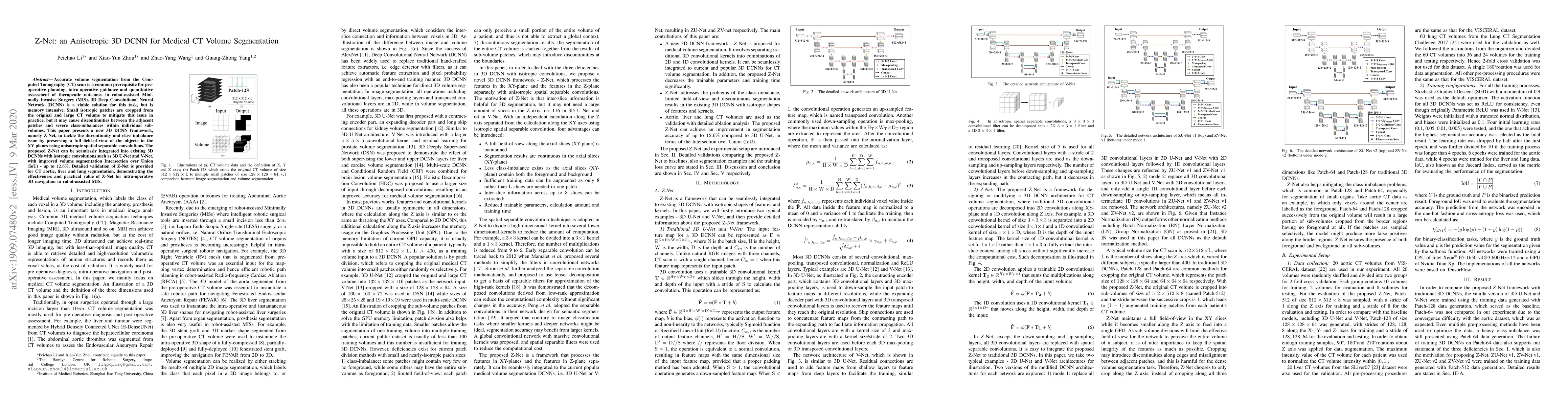 Accurate volume segmentation from the Computed Tomography (CT) scan is a common prerequisite for pre-operative planning, intra-operative guidance and quantitative assessment of therapeutic outcomes in robot-assisted Minimally Invasive Surgery (MIS). 3D Deep Convolutional Neural Network (DCNN) is a viable solution for this task, but is memory intensive. Small isotropic patches are cropped from the original and large CT volume to mitigate this issue in practice, but it may cause discontinuities between the adjacent patches and severe class-imbalances within individual sub-volumes. This paper presents a new 3D DCNN framework, namely Z-Net, to tackle the discontinuity and class-imbalance issue by preserving a full field-of-view of the objects in the XY planes using anisotropic spatial separable convolutions. The proposed Z-Net can be seamlessly integrated into existing 3D DCNNs with isotropic convolutions such as 3D U-Net and V-Net, with improved volume segmentation Intersection over Union (IoU) - up to $12.6\%$. Detailed validation of Z-Net is provided for CT aortic, liver and lung segmentation, demonstrating the effectiveness and practical value of Z-Net for intra-operative 3D navigation in robot-assisted MIS.