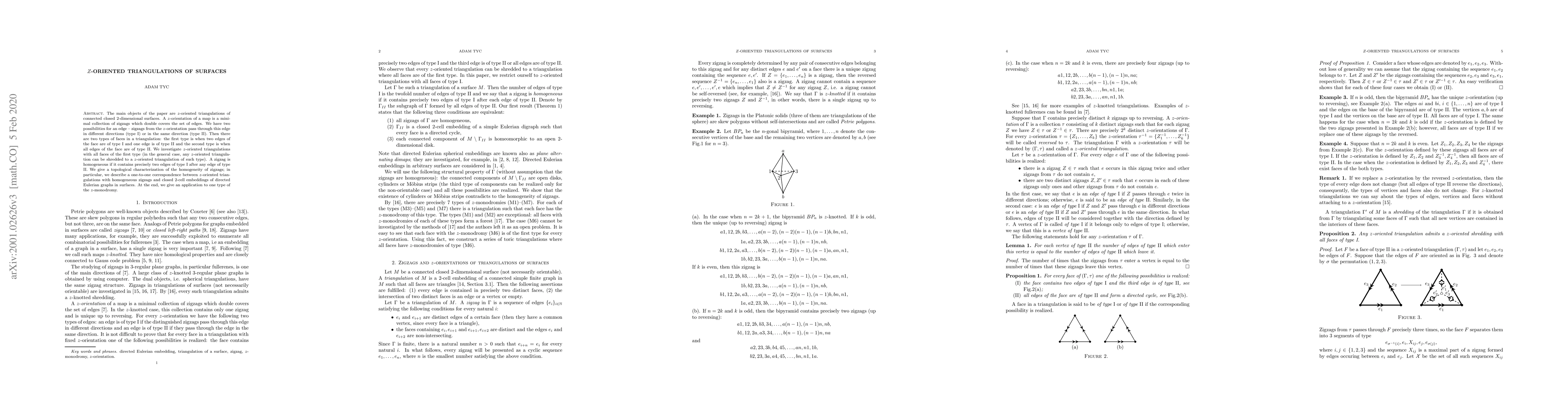 This paper studies $z$-oriented triangulations of closed 2-dimensional surfaces, focusing on those with all faces having two type I edges and one type II edge. It establishes a topological characterization of homogeneous zigzags and their correspondence to directed Eulerian graphs embedded in surfaces, concluding with an application to $z$-monodromy.