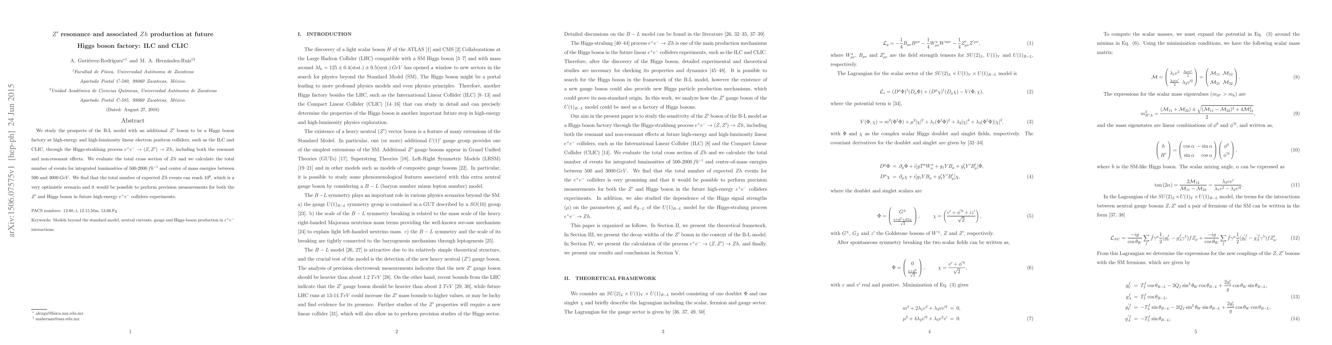 We study the prospects of the B-L model with an additional $Z'$ boson to be a Higgs boson factory at high-energy and high-luminosity linear electron positron colliders, such as the ILC and CLIC, through the Higgs-strahlung process $e^{+}e^{-}\rightarrow (Z, Z') \to Zh$, including both the resonant and non-resonant effects. We evaluate the total cross section of $Zh$ and we calculate the total number of events for integrated luminosities of 500-2000\hspace{0.8mm}$fb^{-1}$ and center of mass energies between 500 and 3000\hspace{0.8mm}$GeV$. We find that the total number of expected $Zh$ events can reach $10^6$, which is a very optimistic scenario and it would be possible to perform precision measurements for both the $Z'$ and Higgs boson in future high-energy $e^+e^-$ colliders experiments.