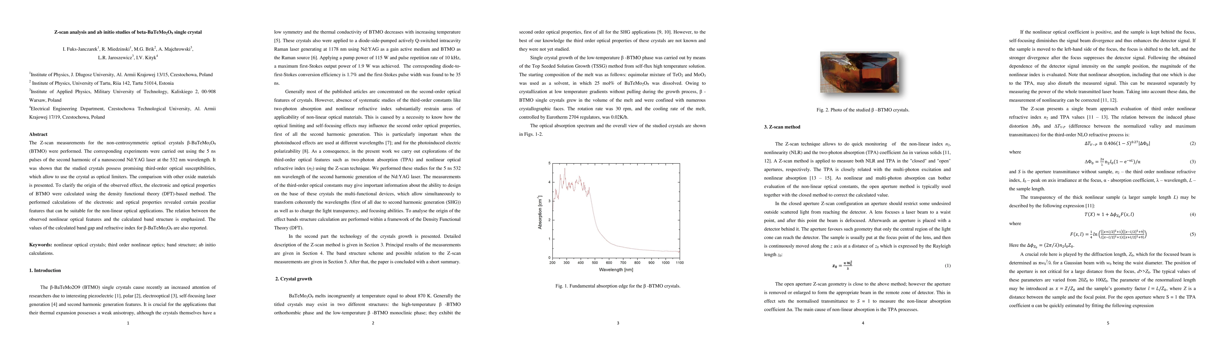 The Z-scan measurements for the non-centrosymmetric optical crystals {\beta}-BaTeMo2O9 (BTMO) were performed. The corresponding experiments were carried out using the 5 ns pulses of the second harmonic of a nanosecond Nd:YAG laser at the 532 nm wavelength. It was shown that the studied crystals possess promising third-order optical susceptibilities, which allow to use the crystal as optical limiters. The comparison with other oxide materials is presented. To clarify the origin of the observed effect, the electronic and optical properties of BTMO were calculated using the density functional theory (DFT)-based method. The performed calculations of the electronic and optical properties revealed certain peculiar features that can be suitable for the non-linear optical applications. The relation between the observed nonlinear optical features and the calculated band structure is emphasized. The values of the calculated band gap and refractive index for {\beta}-BaTeMo2O9 are also reported.