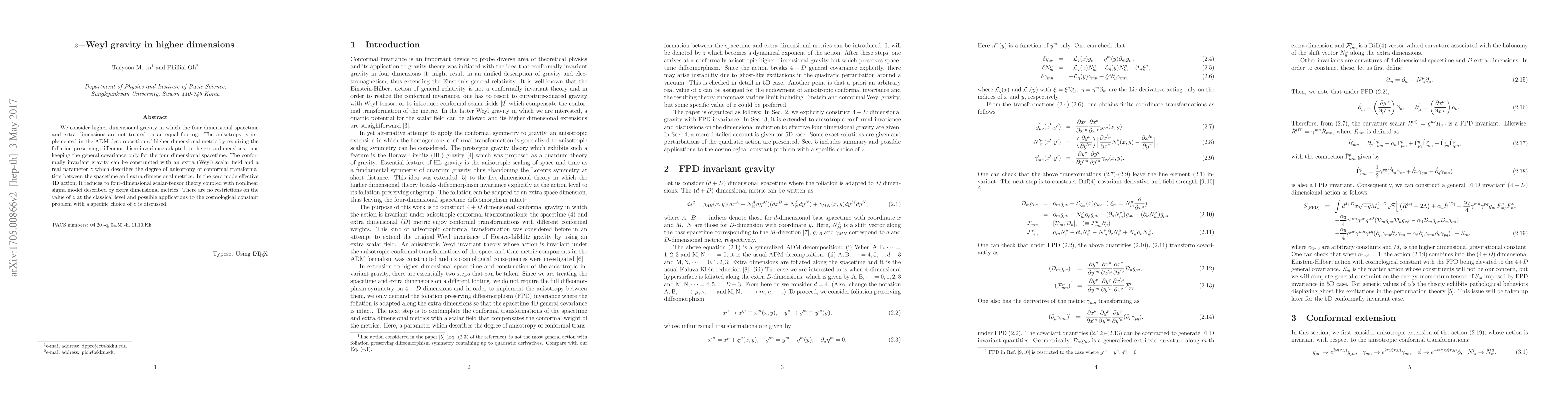 This paper explores higher-dimensional gravity with anisotropic treatment of spacetime and extra dimensions, introducing a $z$-Weyl gravity framework. It constructs conformally invariant gravity using a Weyl scalar field and a $z$ parameter, leading to a four-dimensional effective action resembling a scalar-tensor theory, with potential implications for the cosmological constant problem.