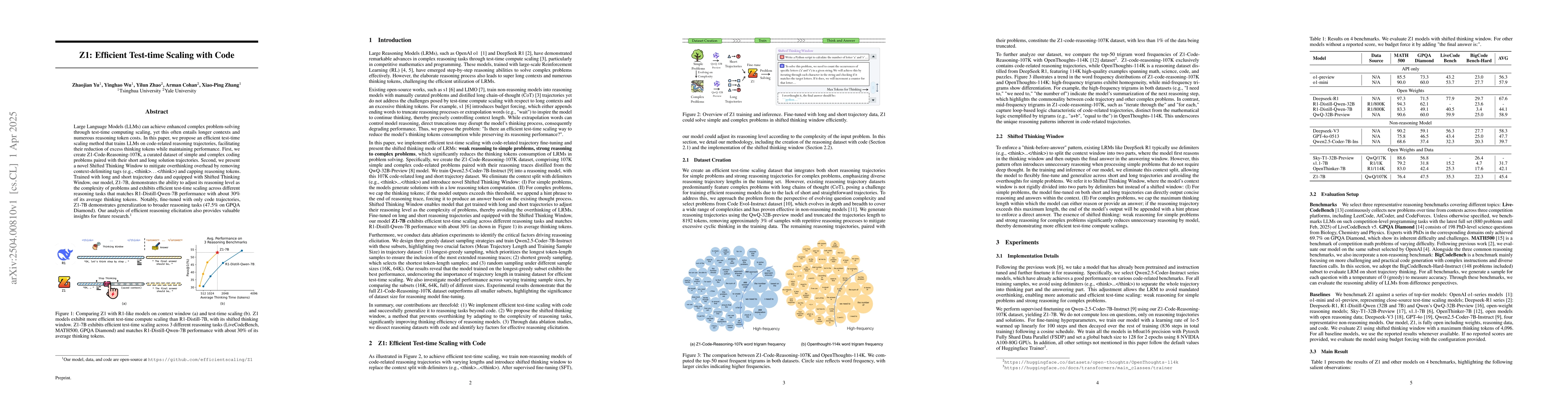 This paper proposes an efficient test-time scaling method for large language models (LLMs) by training them on code-related reasoning trajectories, reducing unnecessary reasoning tokens while maintaining performance. The authors introduce a Shifted Thinking Window technique to mitigate overthinking and present Z1-Code-Reasoning-107K dataset, achieving comparable performance to a larger model with significantly fewer tokens.