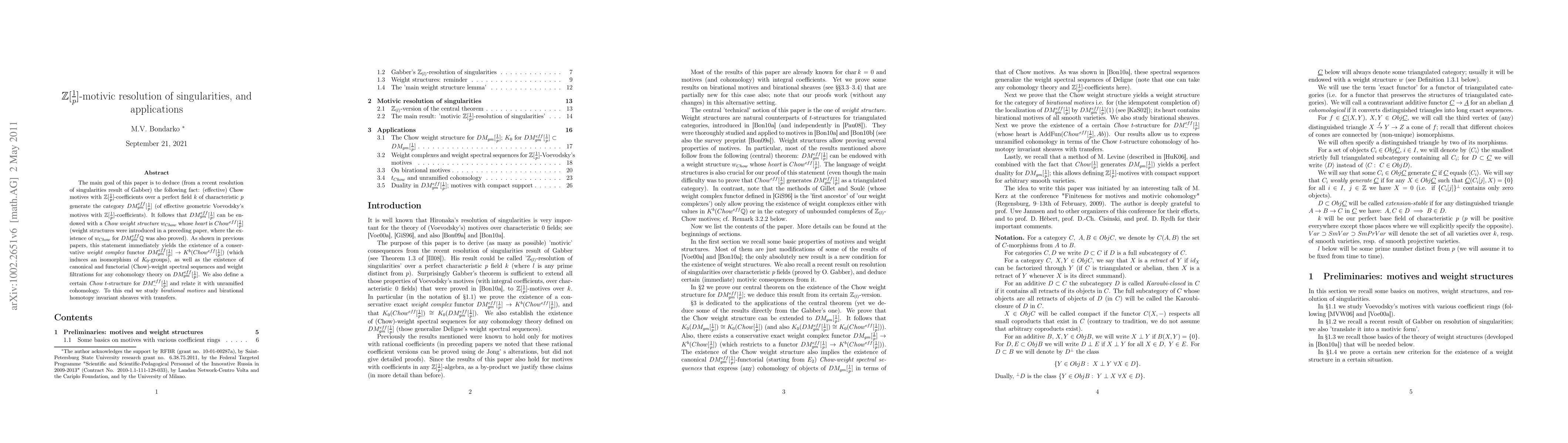 The main goal of this paper is to deduce (from a recent resolution of singularities result of Gabber) the following fact: (effective) Chow motives with $Z[1/p]$-coefficients over a perfect field $k$ of characteristic $p$ generate the category $DM^{eff}_{gm}[1/p]$ (of effective geometric Voevodsky's motives with $Z[1/p]$-coefficients). It follows that $DM^{eff}_{gm}[1/p]$ could be endowed with a Chow weight structure $w_{Chow}$ whose heart is $Chow^{eff}[1/p]$ (weight structures were introduced in a preceding paper, where the existence of $w_{Chow}$ for $DM^{eff}_{gm}Q$ was also proved). As shown in previous papers, this statement immediately yields the existence of a conservative weight complex functor $DM^{eff}_{gm}[1/p]\to K^b(Chow^{eff}[1/p])$ (which induces an isomorphism on $K_0$-groups), as well as the existence of canonical and functorial (Chow)-weight spectral sequences and weight filtrations for any cohomology theory on $DM^{eff}_{gm}[1/p]$. We also define a certain Chow t-structure for $DM_{-}^{eff}[1/p]$ and relate it with unramified cohomology. To this end we study birational motives and birational homotopy invariant sheaves with transfers.