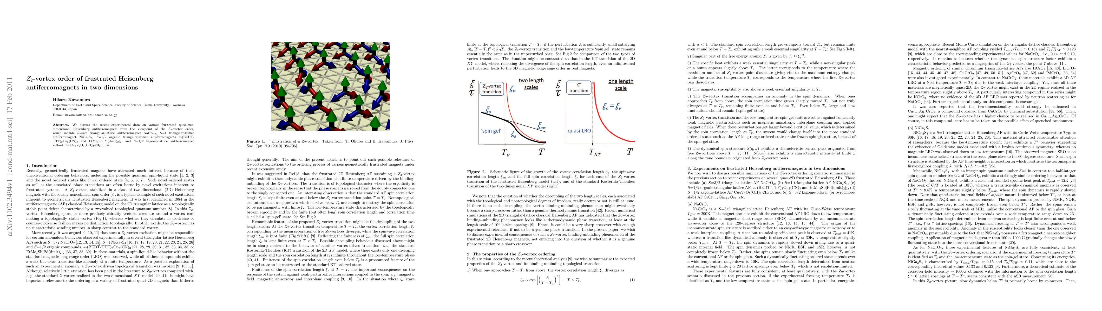 This paper examines experimental data on various frustrated quasi-two-dimensional Heisenberg antiferromagnets, focusing on the Z2-vortex order. It analyzes materials like NaCrO2, NiGa2S4, \kappa-(BEDT-TTF)2Cu2(CN)3, and EtMe3Sb[Pd(dmit)2]2 to understand their magnetic properties and phase transitions.