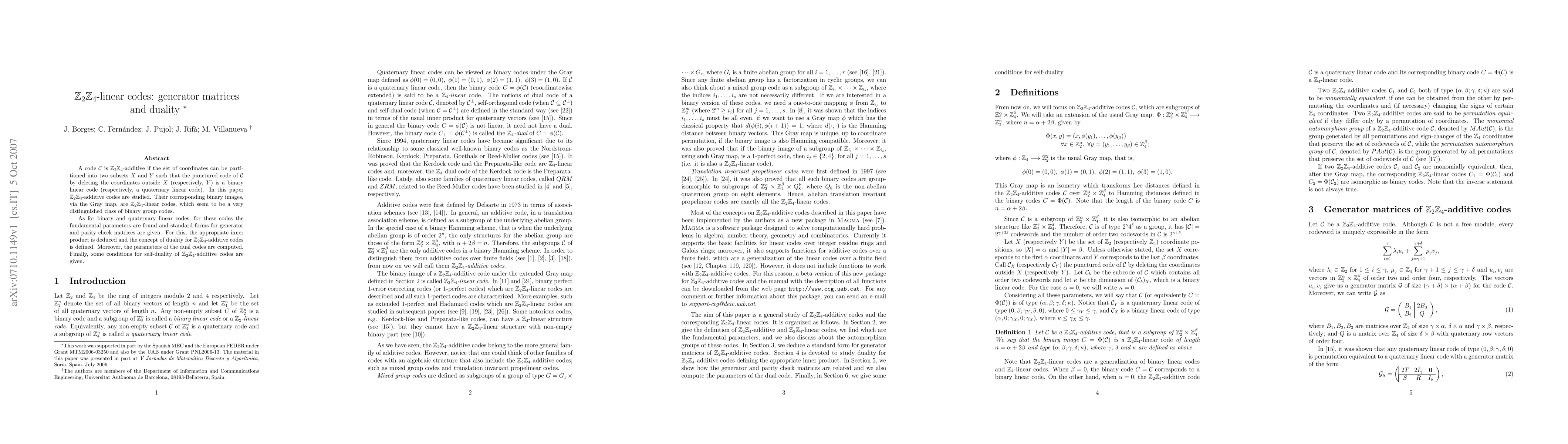 Researchers studied Z2Z4-linear codes, finding generator matrices and duality conditions for this class of group codes, which have applications in binary and quaternary linear coding theory.