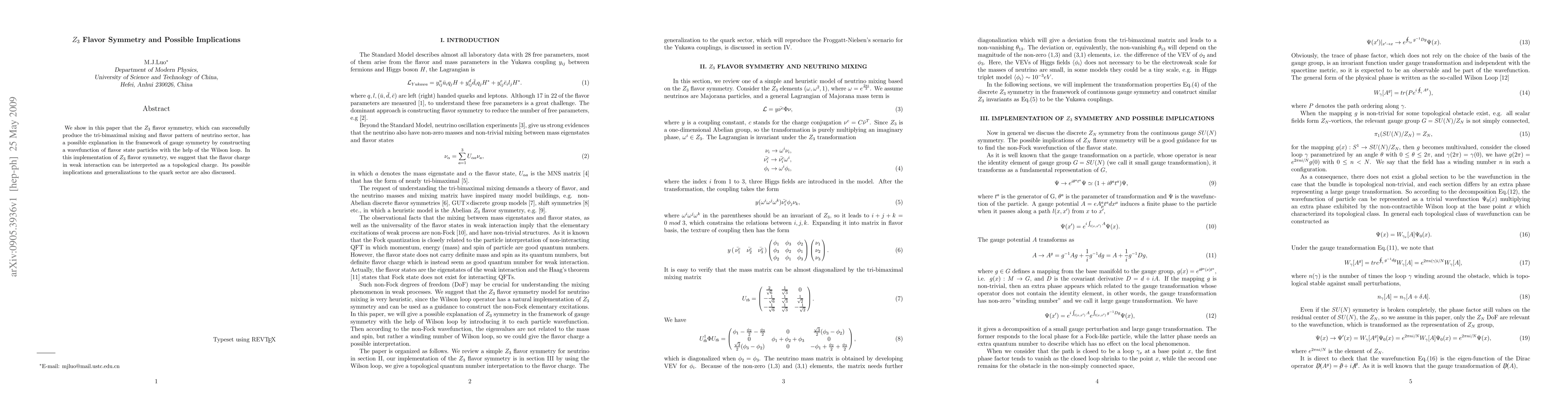 We show in this paper that the Z(3) flavor symmetry, which can successfully produce the tri-bimaximal mixing and flavor pattern of neutrino sector, has a possible explanation in the framework of gauge symmetry by constructing a wavefunction of flavor state particles with the help of the Wilson loop. In this implementation of Z(3) flavor symmetry, we suggest that the flavor charge in weak interaction can be interpreted as a topological charge. Its possible implications and generalizations to the quark sector are also discussed.