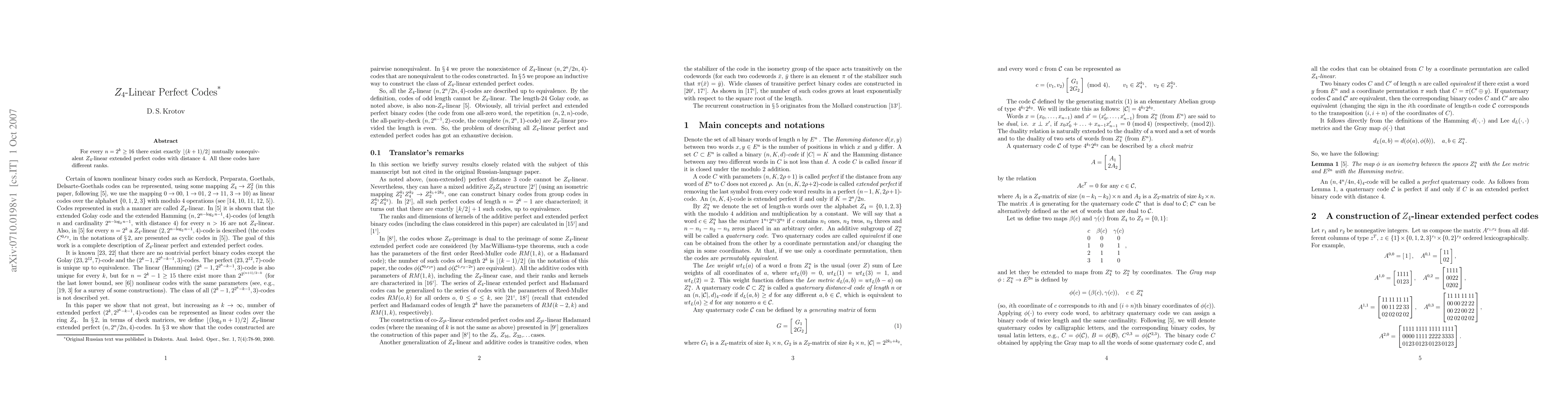 The paper presents a construction of Z4-linear perfect codes using a combination of existing codes, specifically through the use of permutation equivalence and a generalized construction method.
